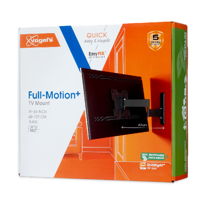 Bevestig je tv aan de muur met de Vogel’s Quick TVM 1249 tv-beugel. Hiermee bevestig je elke tv tussen 19 inch en 43 inch, tot een maximaal gewicht van 15 kilo. Bovendien is de beugel kantelbaar, zodat jij tv kijkt vanaf de bank én de eettafel.