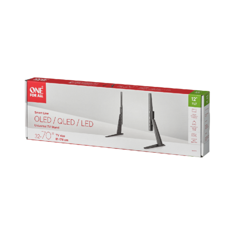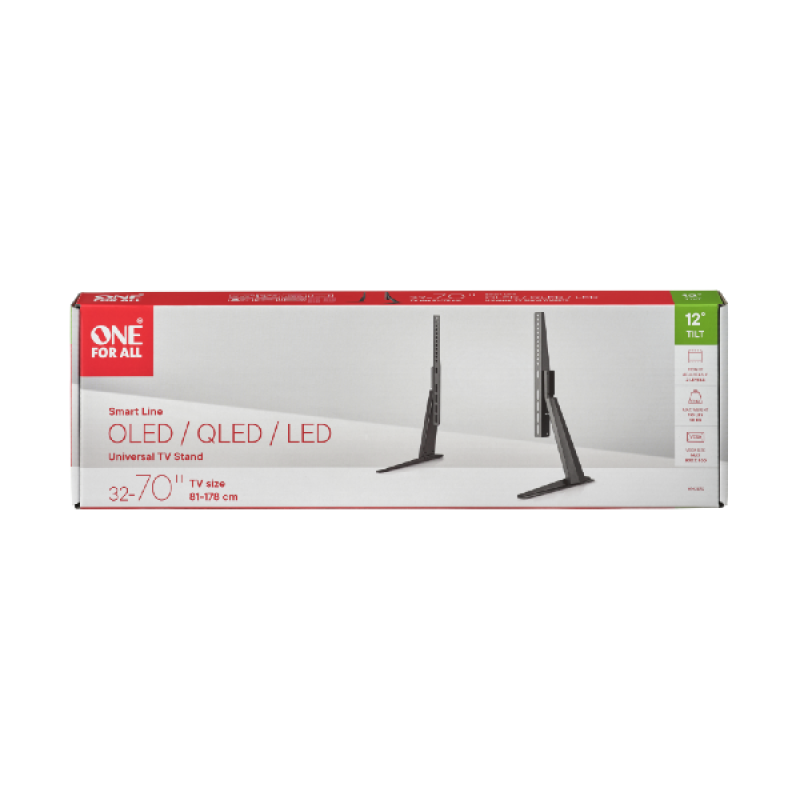 Met deze televisiestandaard van One For All heb jij een stevige plek om je tv neer te zetten. De WM2870 ondersteunt televisies van 32 tot en met 70 inch en maakt gebruik van de 800 x 400 VESA-standaard. Hij is kantelbaar tot maximaal 12° en verstelbaar in 5 hoogtes, terwijl het geïntegreerde kabelmanagementsysteem lelijke kabels uit het zicht houdt.