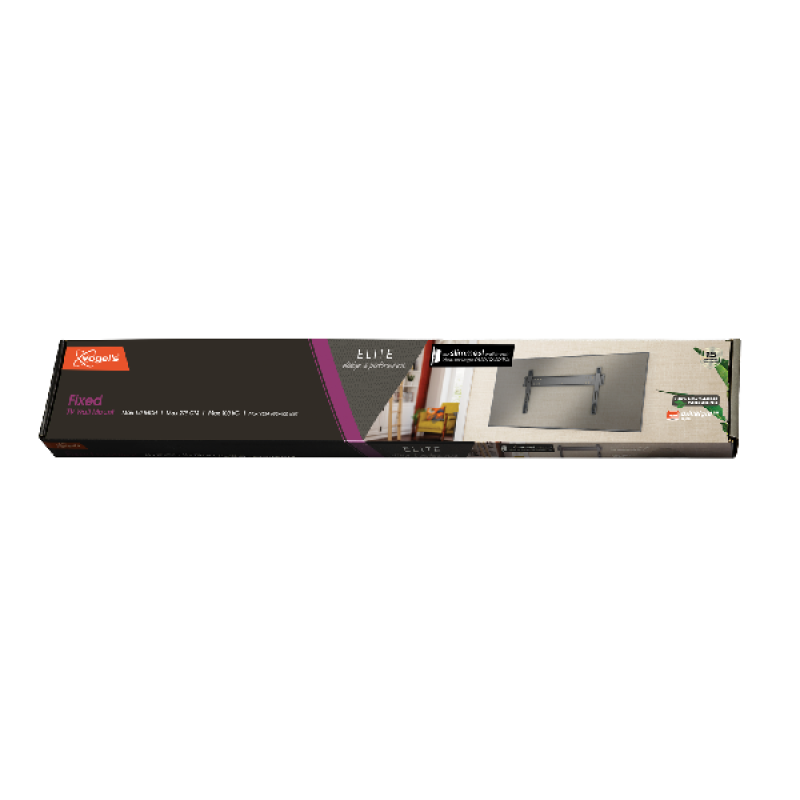 De Vogel’s ELITE TVM 5705 in zwarte uitvoering is een vaste, ultraslanke muurbeugel voor grote tv’s van 40" tot 110". Hij ondersteunt tot 100 kg, is compatibel met VESA 600x400, en zorgt voor een veilige, strakke montage dicht tegen de muur (slechts 1,3 cm). Kortom, een prima oplossing voor een elegante en stabiele installatie.