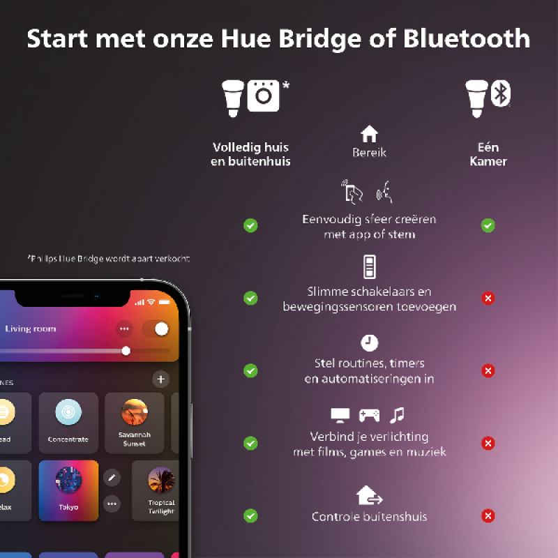 Creëer een gezellige sfeer in huis met de Philips Hue Solo Lightstrip van 5 meter. Deze slimme lichtstrip is voorzien van RGBWW-ledlampen en biedt zeer helder licht (1.700 lumen) in allerlei verschillende kleuren en wittinten. Of je hem nu achter je tv installeert om je entertainment een boost te geven, langs je aanrecht plaatst om je keuken moderner te maken of toch een andere plek in gedachten hebt: de installatie is in een handomdraai geregeld. Plaats simpelweg de strip waar je wilt, steek de stekker in het stopcontact en knip hem zo nodig op maat. Let op: eenmaal doorgeknipt zijn losse stukken niet meer aan elkaar te verbinden. En de bediening is net zo eenvoudig als de installatie. Gebruik de Hue-app, je stem of Hue-accessoires (zoals de dimmer switch, apart verkrijgbaar) om de ledstrip te bedienen, gewoon vanuit je luie stoel. Wil je nog meer slimme functies ontgrendelen? Koppel deze Hue-verlichting dan aan een Philips Hue Bridge (apart verkrijgbaar).