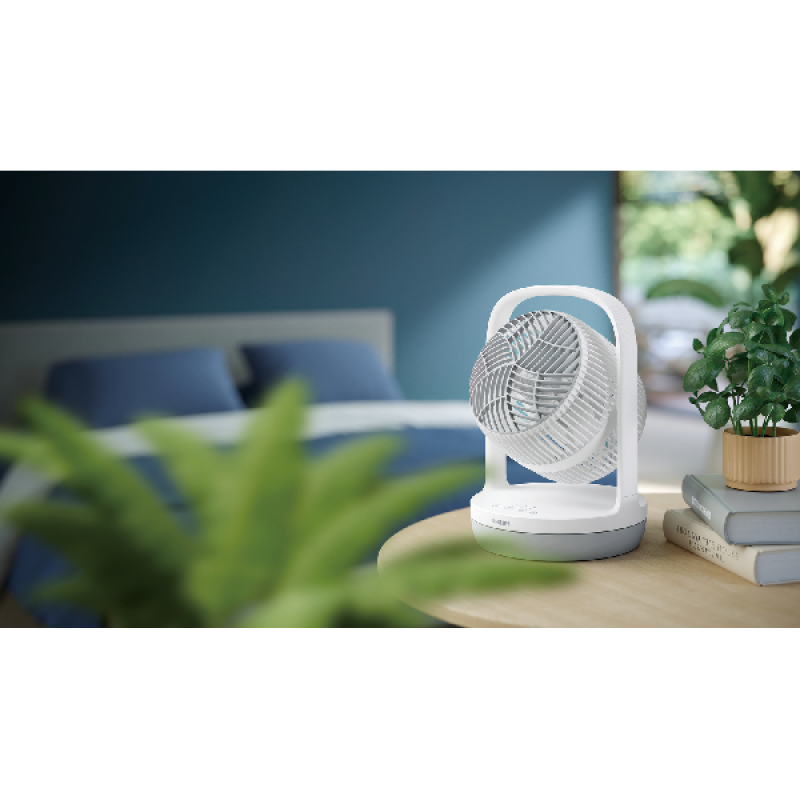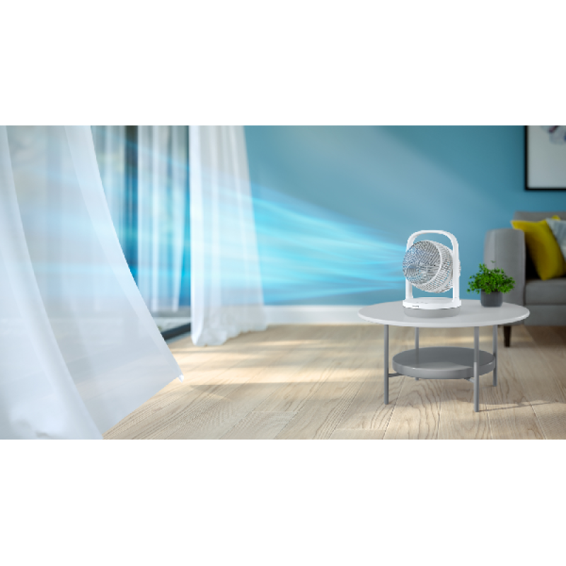 Verkoeling is altijd binnen handbereik met de CX2050/00. Je zet deze compacte ventilator neer waar jij maar wilt. Is je werkdag afgelopen, en verplaatst je dag zich van je thuiskantoor naar de woonkamer? Pak de ventilator bij het handige handvat en neem ‘m gewoon met je mee. Dankzij de kantelbare kop pas je de hoek gemakkelijk aan, voor een fris briesje waar jij dat wilt. Met een luchtstroom van maar liefst 738 m³/u en een bereik tot 25 meter ontstaat er een verfrissende luchtcirculatie die elke hoek van de kamer bereikt. Zo geniet jij overal in de ruimte van verkoeling.