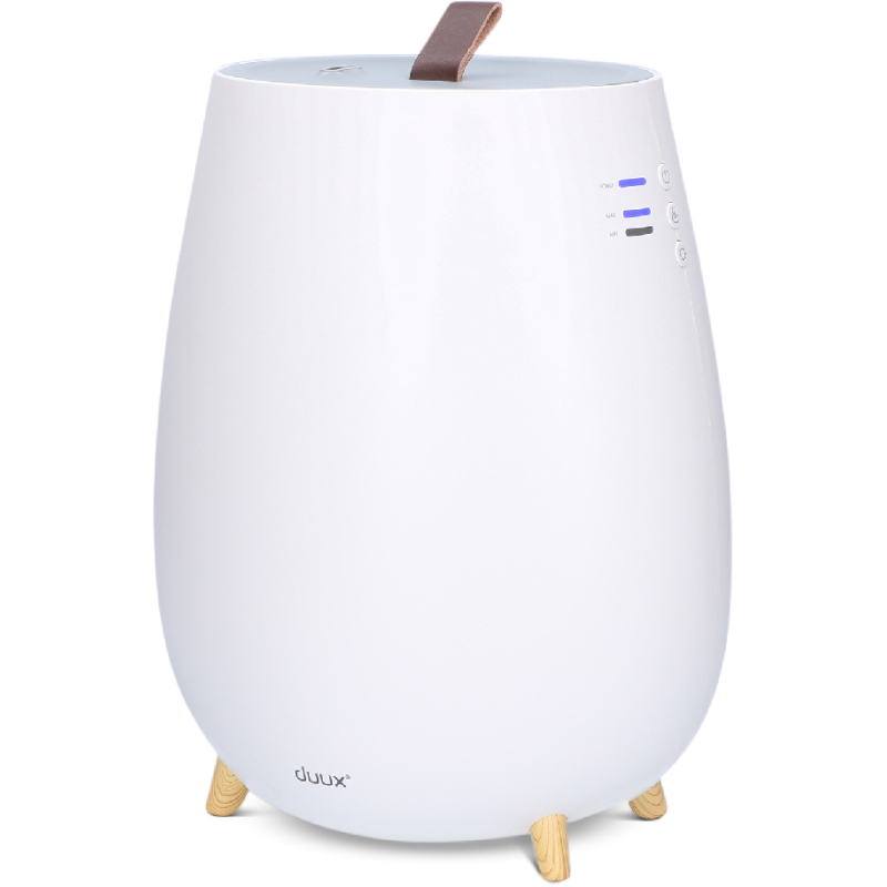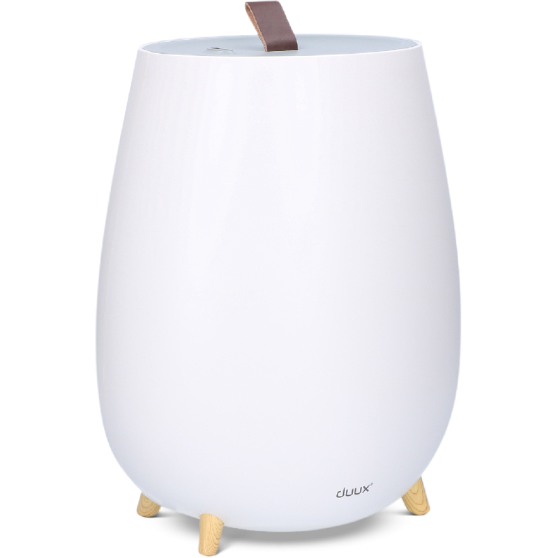 Met de Duux Tag 2 zorg je voor een prettig binnenklimaat in huis door droge lucht geruisloos te bevochtigen met koude nevel. Zo heb je geen last meer van hoofdpijn, vermoeidheid, prikkende ogen of statische elektriciteit door droge lucht. Deze luchtbevochtiger heeft een stille werking, doordat de koude nevel wordt gemaakt door ultrasone geluidstrillingen die voor het menselijk oor niet hoorbaar zijn. Verder werkt hij energiezuinig: hij verbruikt tot 80% minder stroom dan tradionele stoombevochtigers. Dankzij het grote waterreservoir van 2,5 liter gaat de Tag 2 tot wel 10 uur mee. Wanneer het reservoir bijna leeg is, kleurt de verlichting aan de onderkant automatisch rood. De cartridge in de watertank houdt bacteriën buiten de deur en voorkomt kalkaanslag, zowel in het apparaat als in de nevel. Dit zorgt ervoor dat de luchtbevochtiger makkelijk te onderhouden is en je geen last hebt van witte neerslag in je huis als gevolg van kalk.