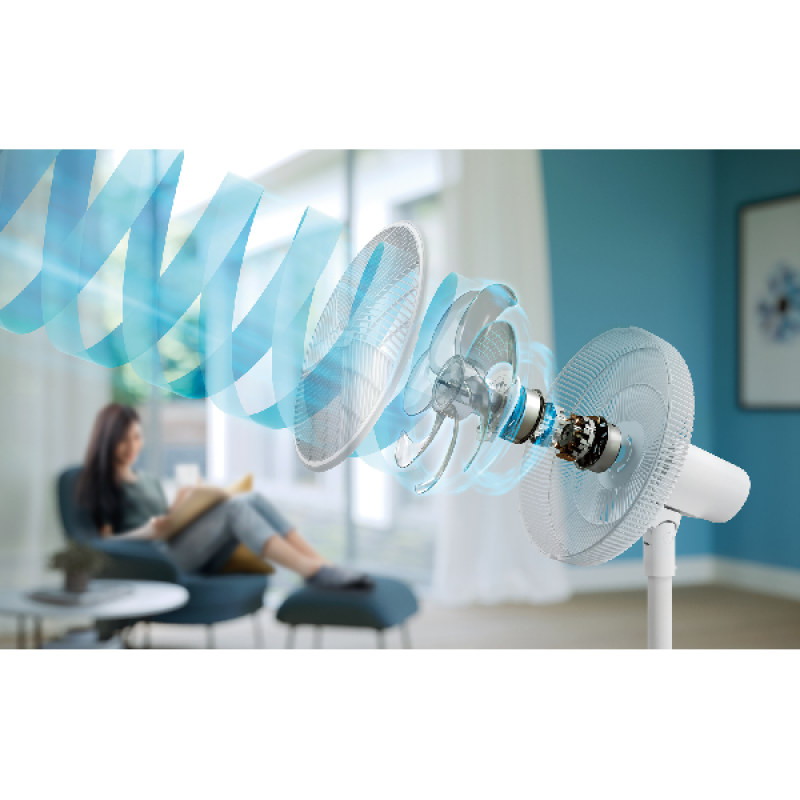 Verkoeling is altijd binnen handbereik met de CX2550/00. Er is altijd wel een handig plekje te vinden voor deze staande ventilator. En je bouwt ‘m ook makkelijk om tot een tafelventilator door een deel van de stang weg te nemen. Lekker veelzijdig! Dankzij de kantelbare kop pas je de hoek bovendien gemakkelijk aan, voor een fris briesje waar jij dat wilt. Met een luchtstroom van maar liefst 2562 m³/u en een bereik tot 30 meter ontstaat een verfrissende luchtcirculatie die elke hoek van de kamer bereikt. Zo geniet jij overal in de ruimte van verkoeling.
