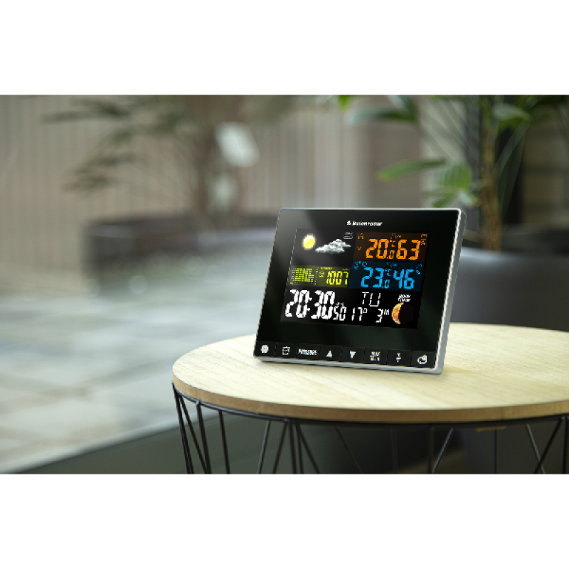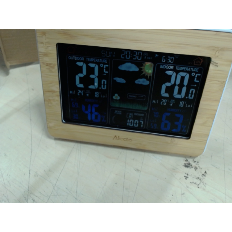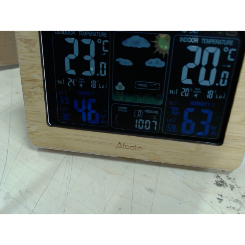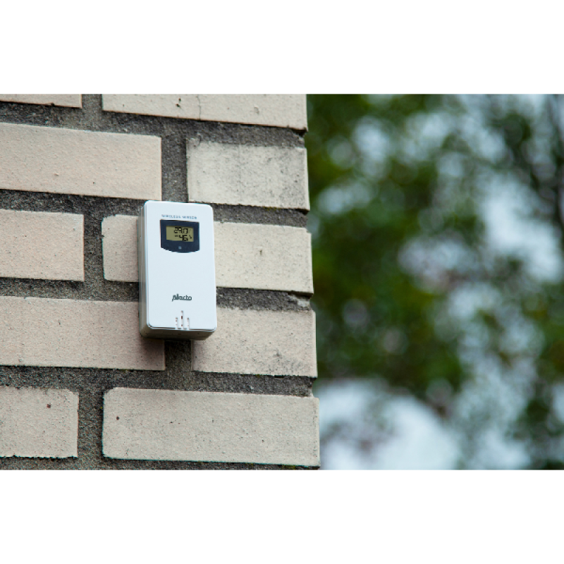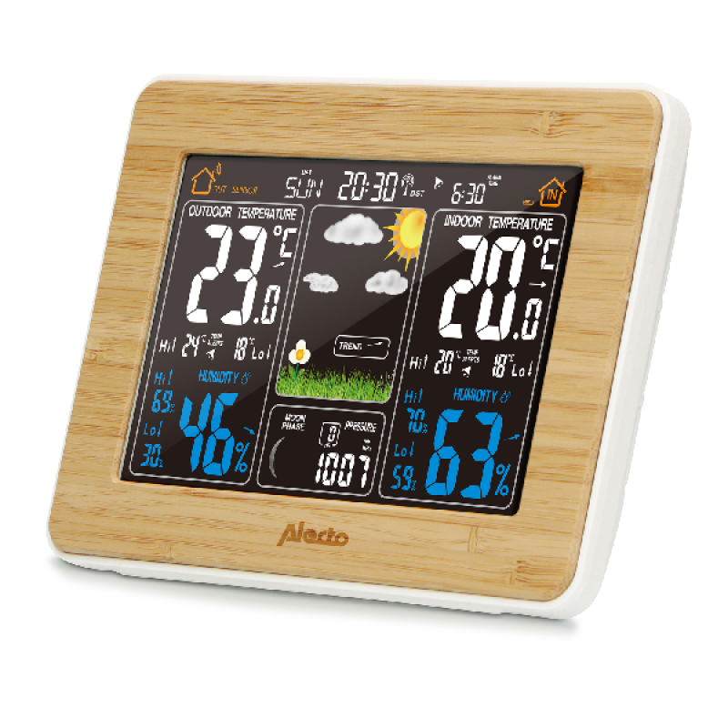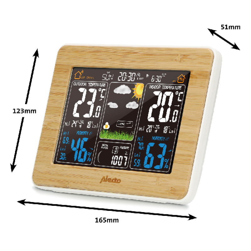 Met het Alecto WS-1560-weerstation ben je altijd op de hoogte van de temperatuur, luchtvochtigheid en neerslag. Het draadloze weerstation bestaat uit een binnen- en een buitenunit die werken op batterijen. Het verlichte 5,7inch-display met een stijlvolle bamboe omlijsting plaats je binnen. Hierop lees je de laatst en hoogst gemeten waarden duidelijk af. Ook heeft het weerstation een maanfase-indicator, een waarschuwing bij ijsvorming en worden de datum, dag en tijd weergegeven. De buitensensor geeft metingen door aan het display binnen. Je plaatst de sensor binnen een bereik tot 100 meter van het display. De wekker met snooze maakt het mogelijk om op een vast tijdstip van de dag gewekt te worden om de gegevens te controleren voordat je de deur uitgaat.