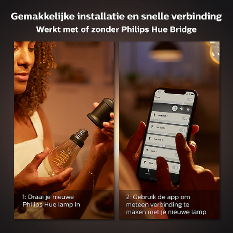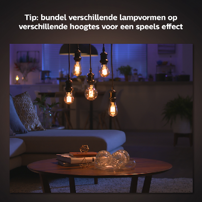 Met deze stijlvolle Philips Hue Filamentlamp Globe G125 met E27-fitting creëer je moeiteloos de juiste sfeer. De lichtsterkte van deze slimme kooldraadlamp in bolvorm stel je eenvoudig naar wens in voor een warmwitte gloed op maat. Hij kan gedimd worden tot een subtiel nachtlampje. Via Bluetooth bedien je deze lamp met gloeiende binnenspiraal direct of je koppelt hem aan een Hue bridge (los verkrijgbaar) voor toegang tot alle beschikbare verlichtingsfuncties, zoals het personaliseren van lichtscènes, het instellen van timers en nog veel meer. Daarnaast kun je de lamp handsfree bedienen met spraakcommando’s. Dankzij de Alexa-, Google Assistant- en Siri-ondersteuning stel je meerdere lampen of een enkel exemplaar in met eenvoudige spraakopdrachten. Met de Philips Hue Filamentlamp Globe met E27-fitting geniet je op elk moment van de dag van gepast licht.