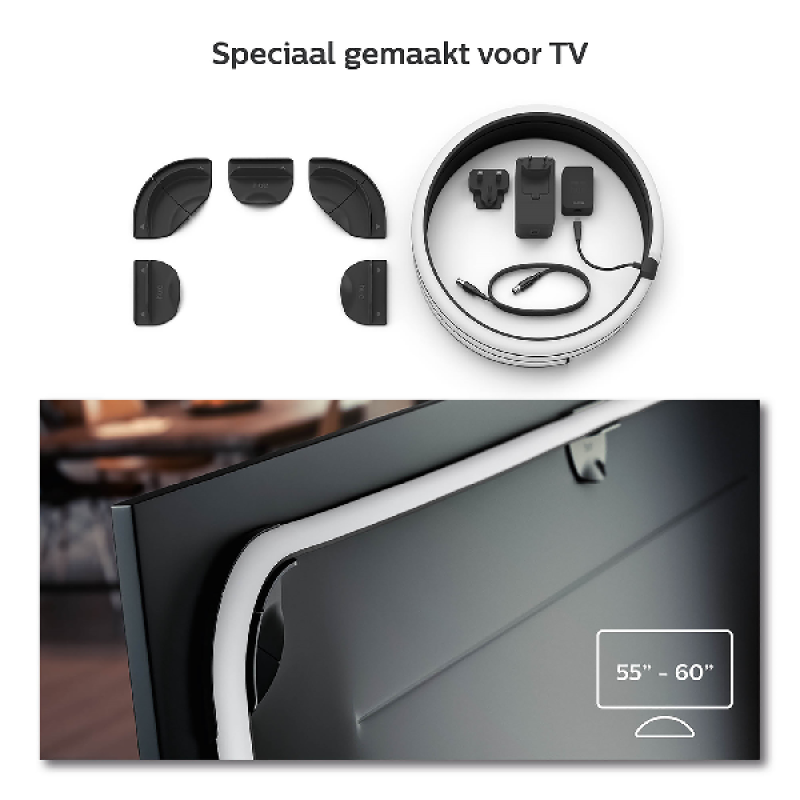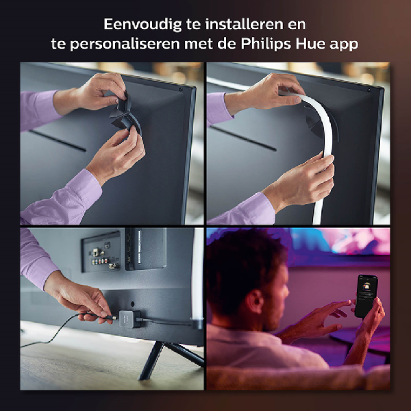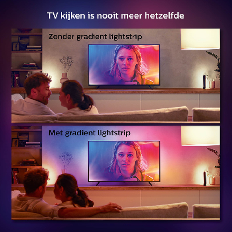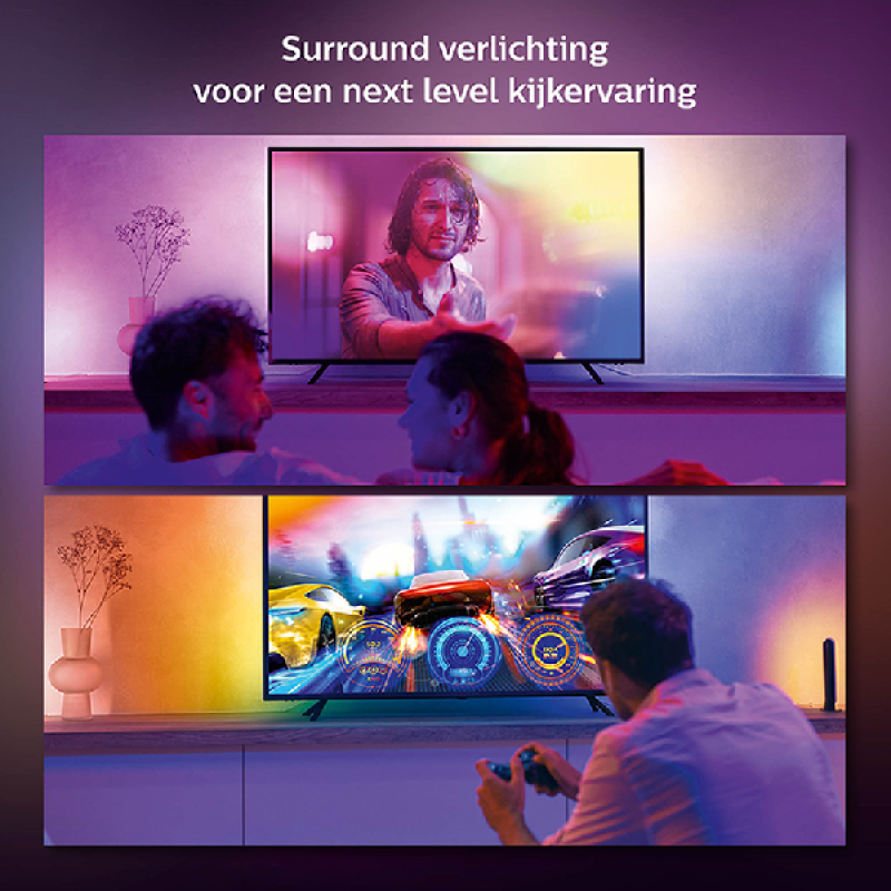 Met de Philips Hue Play lightstrip beleef je films als nooit tevoren. Deze slimme ledstrip bevestig je eenvoudig achter je televisie om de wand erachter mee te laten kleuren met de beelden op je televisie. Met 16 miljoen kleuren kiest de strip precies de juiste kleur en laat je de wand achter de televisie meebewegen met de beelden waar je naar kijkt. Zo creëer je in een handomdraai surround-verlichting. De kleuren lopen natuurlijk in elkaar over en creëren een uniek effect achter de tv. Hierbij lijkt het scherm van je televisie ook een stuk groter. Niet alleen bewegen de lichten mee, maar je kunt dit ook geheel naar eigen wens instellen. Hiermee stel je de helderheid, snelheid en intensiteit van effecten in door middel van de Philips Hue app. Het is ook mogelijk om Philips Hue lampen te laten mee kleuren. Let op: zodra je wil dat de kleuren van je televisie met de strip mee kleuren, moet je deze aansluiten op de Philips Hue Play HDMI Sync Box en heb je de Philips Hue Bridge nodig om met andere Philips Hue lampen te verbinden. Op deze bridge kun je vervolgens tot 50 lampen en slimme accessoires in je hele huis aansluiten en instellen. De Philips Hue Play lightstrip is geschikt voor televisies tussen de 55 en 65 inch.