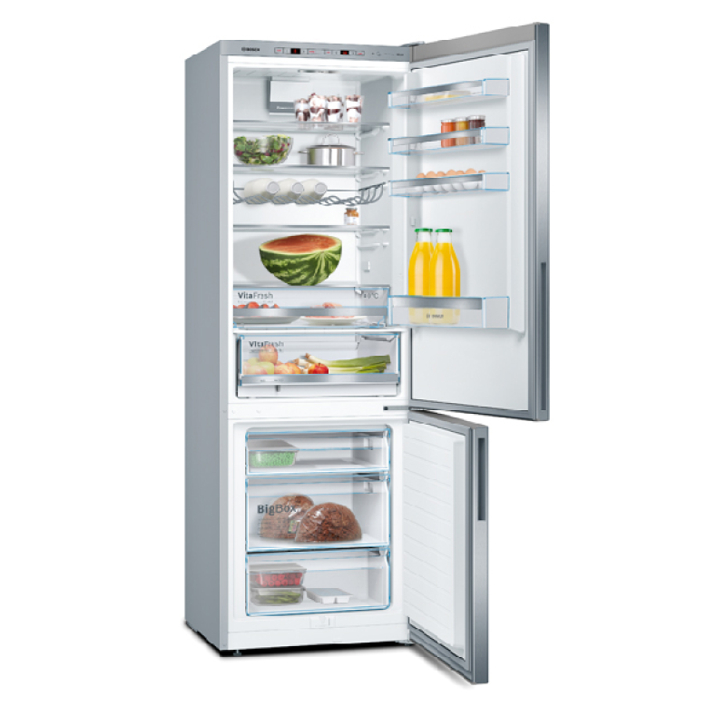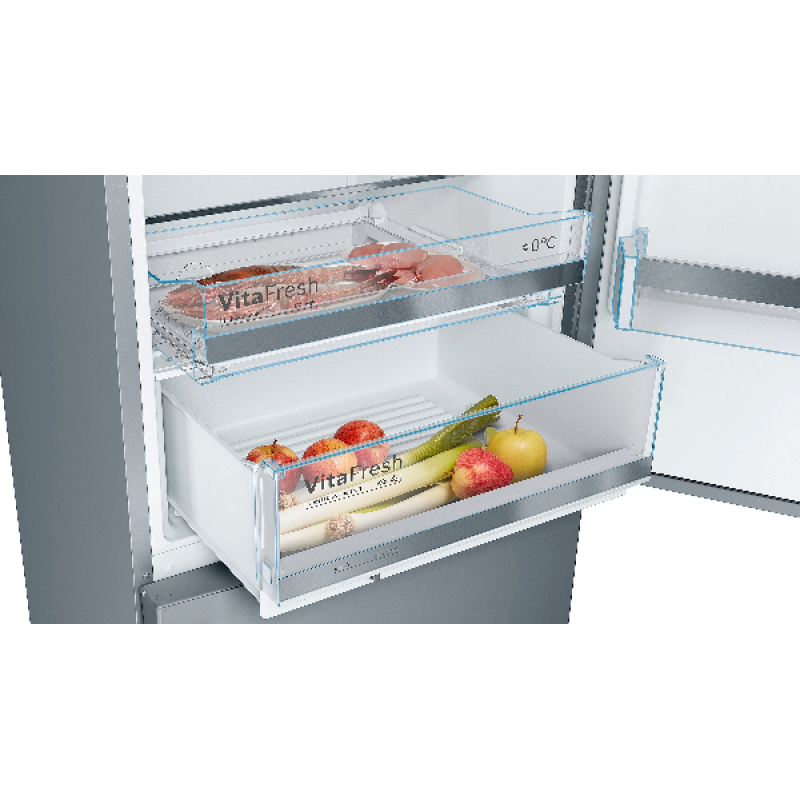 De Bosch KGE49AICA is maar liefst 70 centimeter breed en heeft een riante inhoud van 419 liter. Daarmee is deze koelvriescombinatie 10 centimeter breder dan reguliere koelkasten en biedt hij genoeg ruimte voor al jouw koelwaren. Je kunt jouw boodschappen bijvoorbeeld makkelijk kwijt op 1 van de 5 plateaus in de koelkast, waarvan 2 in hoogte verstelbaar zijn en 4 uitschuifbaar. Flessen blijven stevig liggen op het flessenrooster en grote diepvrieswaren kun je kwijt in de grote BigBox-lade. De koelkast beschikt bovendien over handige functies. Het VitaFresh-vershoudsysteem bijvoorbeeld, streeft een extra lange houdbaarheid van voedsel na. Zo heeft de onderste lade exact de juiste luchtvochtigheid, waardoor de versheid, smaak en voedingswaarden van groente en fruit langer behouden blijft. De bovenste VitaFresh-lade is een 0 graden-zone, waarin je worst, kaas, vlees en vis goed bewaart. Het vriesgedeelte van de Bosch KGE49AICA heeft ook genoeg functionele eigenschappen. Zo hoef jij deze niet alleen minder vaak te ontdooien dankzij LowFrost, dat de vorming van ijs vermindert, maar beschikt hij ook over automatisch SuperVriezen. Deze functie wordt automatisch geactiveerd als de vriezer temperatuurwijziging detecteert. Nieuwe etenswaren worden dan snel ingevroren en reeds geplaatste producten blijven goed bevroren.