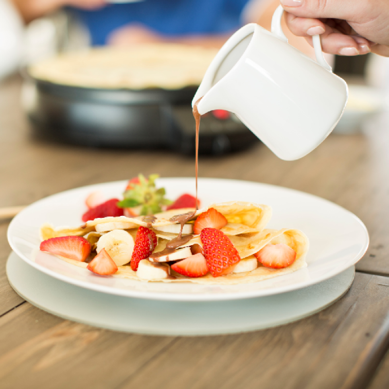 Maak heerlijke crêpes met de Fiesta Crepe Maker 20920-56 van Russell Hobbs. Dankzij het vermogen van 1.000 watt serveer je je heerlijke creaties in een handomdraai. De bakplaat van 30 cm is voorzien van een antiaanbaklaag en een opstaande rand, zodat er geen restjes blijven plakken en je aanrecht schoon blijft. De crêpemaker is ook makkelijk in gebruik, met een eenvoudige aan-/uitknop, een schuifregelaar voor de temperatuur en een indicatielampje dat aangeeft wanneer de crêpe klaar is. De bakplaat warmt ook helemaal gelijkmatig op, zodat je crêpes telkens mooi egaal zijn. De crêpemaker wordt geleverd met spatel en deegverdeler, zodat je er thuis gelijk makkelijk mee aan de slag gaat.