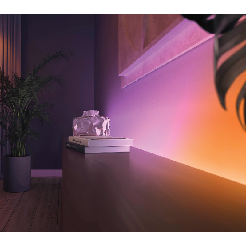 Personaliseer jouw leefruimte met de Philips Hue White and Color Ambiance Gradient Lightstrip Basis van 2 meter. De lichtstrip zorgt voor sfeervolle verlichting in je favoriete kleur of wittint – of zelfs meerdere kleuren tegelijk! Je selecteert de helderheid, de kleur en het kleurverloop van de lichtstrip gewoon met de Hue-app.