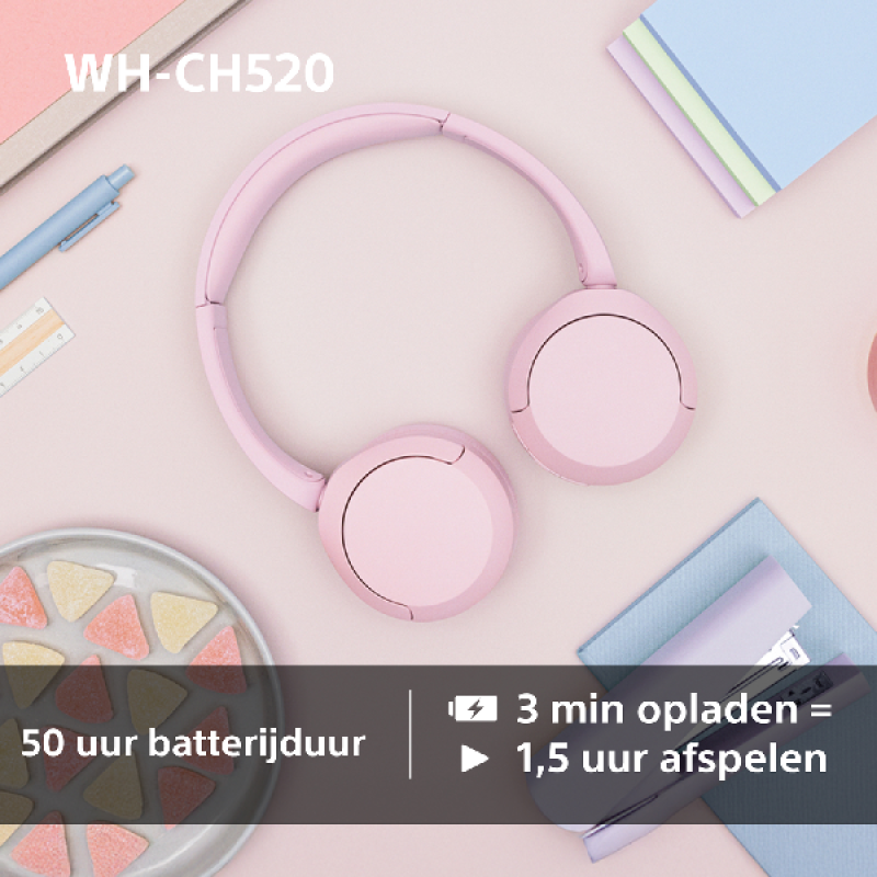 Luister als vanouds naar muziek met de Sony WH-CH520. De Digital Enhancement Engine (DSEE) herstelt namelijk de harmonie in een levendigheid die verloren gaat bij gewone muziekcompressie. Bovendien heeft de koptelefoon multipoint-verbinding, zodat jij kan werken op je laptop zonder dat je oproepen op je telefoon mist. Overigens kun je meteen handsfree bellen dankzij de ingebouwde microfoon, die jouw stem helder opneemt. Ook is de WH-CH520 ontworpen voor comfort. De koptelefoon is licht, met zachte behuizing en draaibare oorschelpen, zodat hij de hele dag lekker zit. Dat is maar goed ook, want met een accuduur van 50 uur hoef je hem zelden af te zetten.