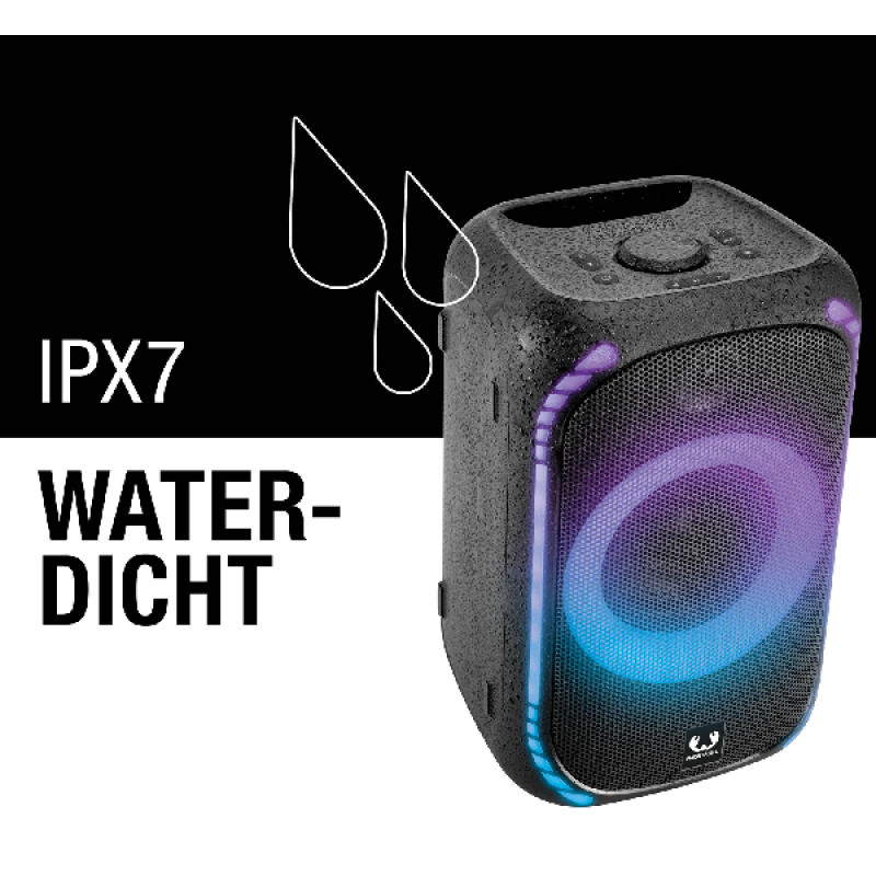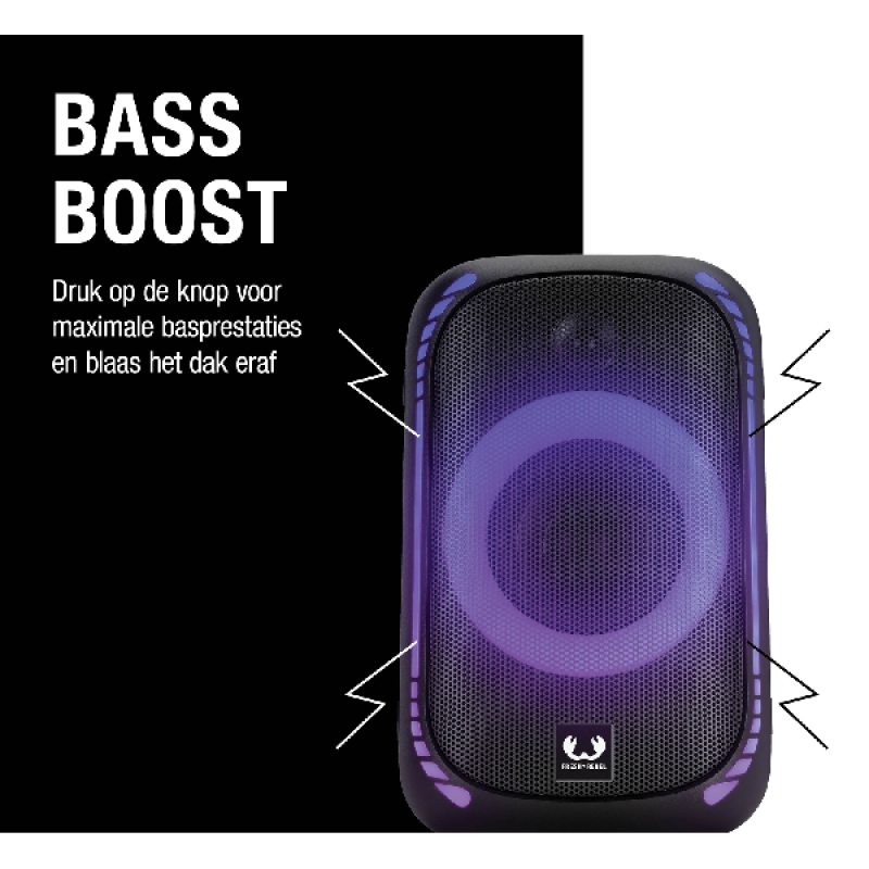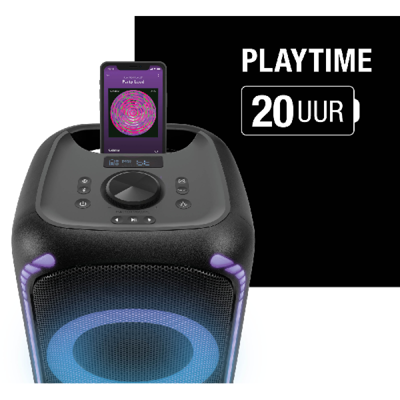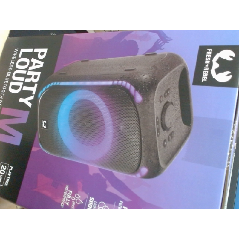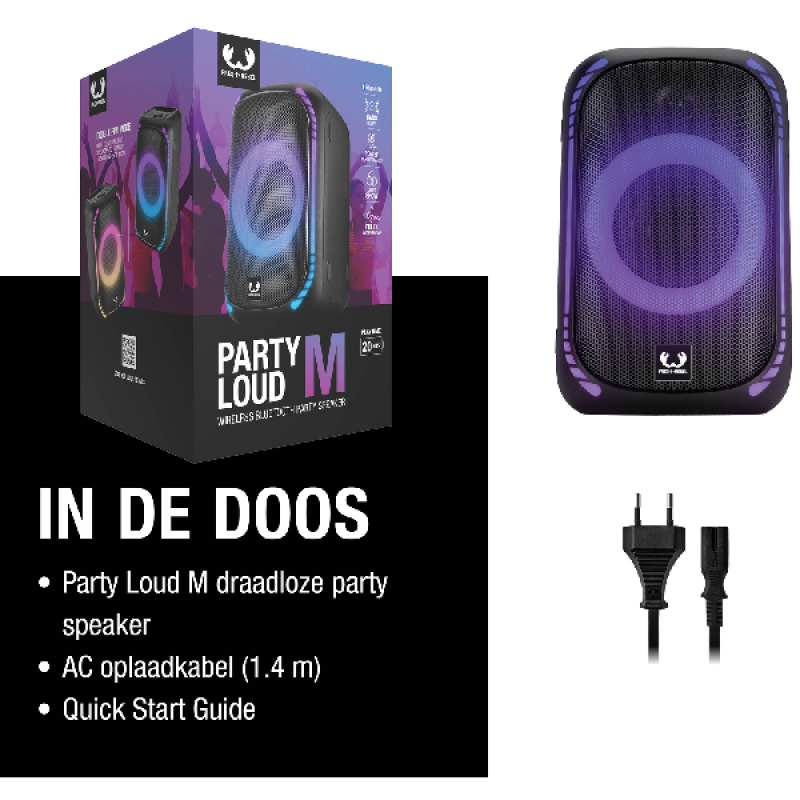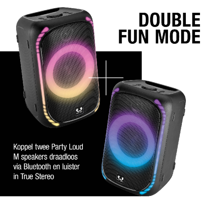 Met de Fresh ’n Rebel Party Loud M neem jij het feestje overal mee naartoe. Dankzij het vermogen van 200 watt geniet je overal van levendig geluid, een vibrerende bas en geweldig volume. Dat geweldige volume breid je uit door de bluetoothspeaker met nog een Party Loud-speaker te koppelen. In deze Double Fun Mode heb je dubbel zoveel volume: ideaal als je een feestje geeft in een grotere ruimte of buiten. De speaker is sowieso zeer geschikt voor feestjes buiten, want hij is waterdicht. Een spontane regenbui of omgevallen drankje is dus geen probleem. Wil je ‘m toch naar binnen verplaatsen? Dankzij het geïntegreerde handvat is verplaatsen een fluitje van een cent. Waar je het feest ook viert, met de Bass Boost en de 6 verlichtingsopties van de speaker til je de sfeer naar het volgende niveau. En dat spectaculaire feest gaat de hele nacht door, want de speaker biedt tot 20 uur draadloze speelduur. Toch leeg? Binnen 3 uur is hij weer opgeladen, en hij is ook gewoon bedraad te gebruiken.
