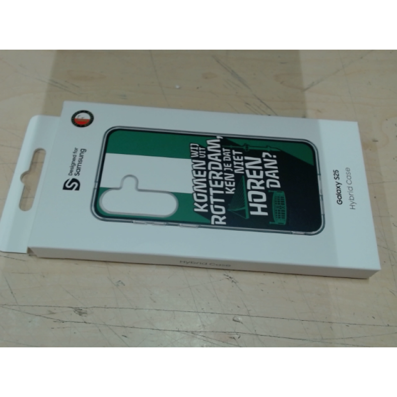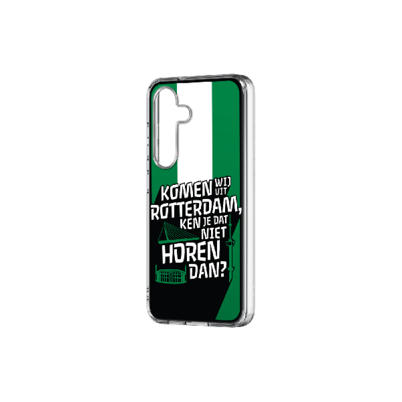 De Rotterdam Hybrid case van Samsung beschermt je Samsung S25 smartphone tegen stoten. Het is gemaakt van supersterk polycarbonaat en heeft een groen en wit design waar echte Rotterdam- en Feyenoord-fans blij mee zullen zijn