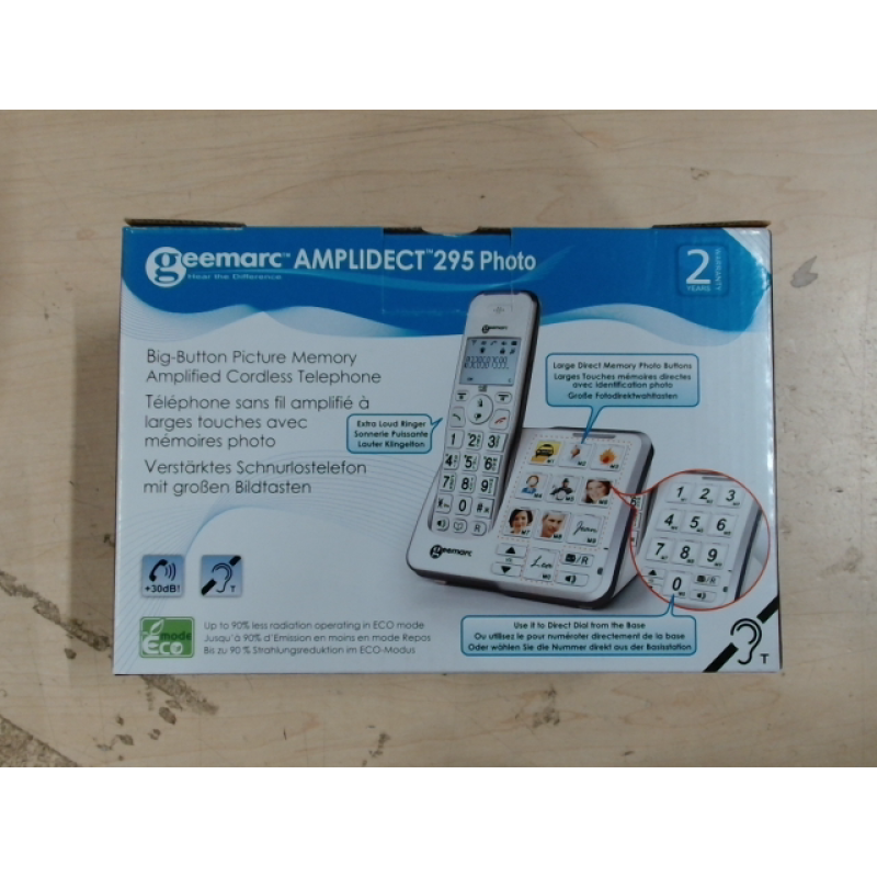 De Amplidect 295 Photodect seniorentelefoon van Geemarc is een draadloze telefoon met grote toetsen en waarmee je jouw favoriete nummers belt vanaf het basisstation dankzij de 10 fotogeheugentoetsen. Bel ook jouw contacten zonder de hoorn op te nemen door gewoon 3 seconden op de foto van jouw geliefde te drukken en de telefoon belt automatisch het nummer. De seniorentelefoon schakelt dan over naar de luidsprekerstand. Het apparaat is compatibel met hoorapparaten. In het telefoonboek sla je tot 50 namen en nummers op. Met de nummerherhalingstoets herhaal je het laatstgekozen nummer. Verder beschikt het apparaat over een mute-functie. Het ontvangstvolume en het volume van de luidspreker regel je eenvoudig.