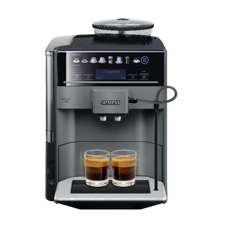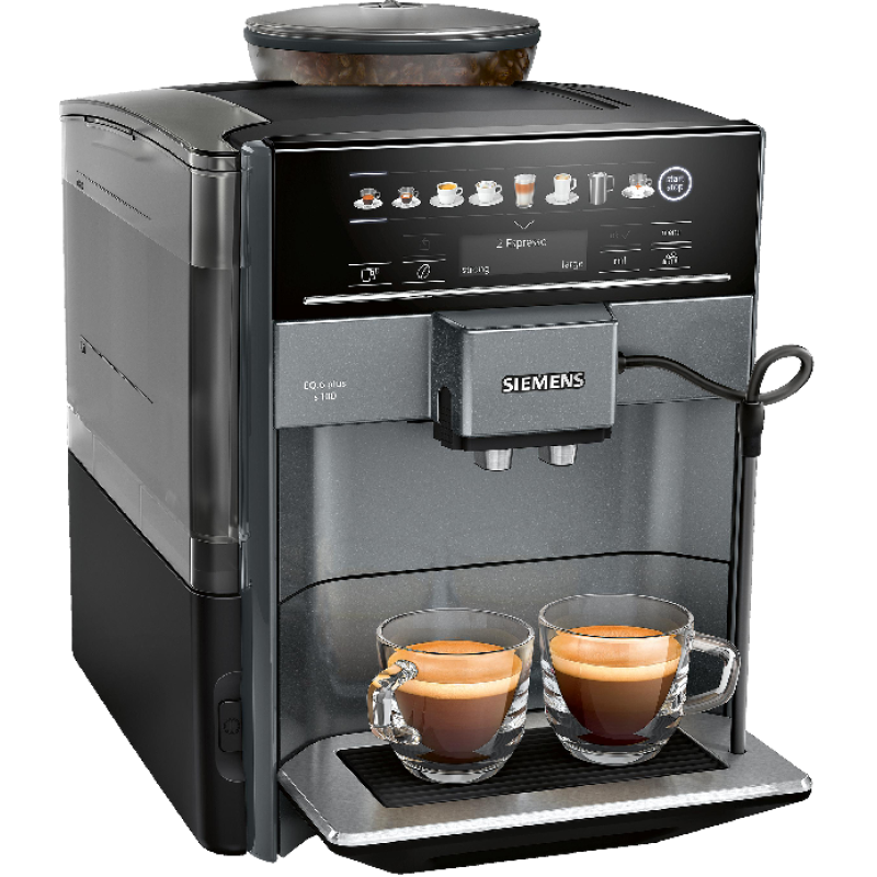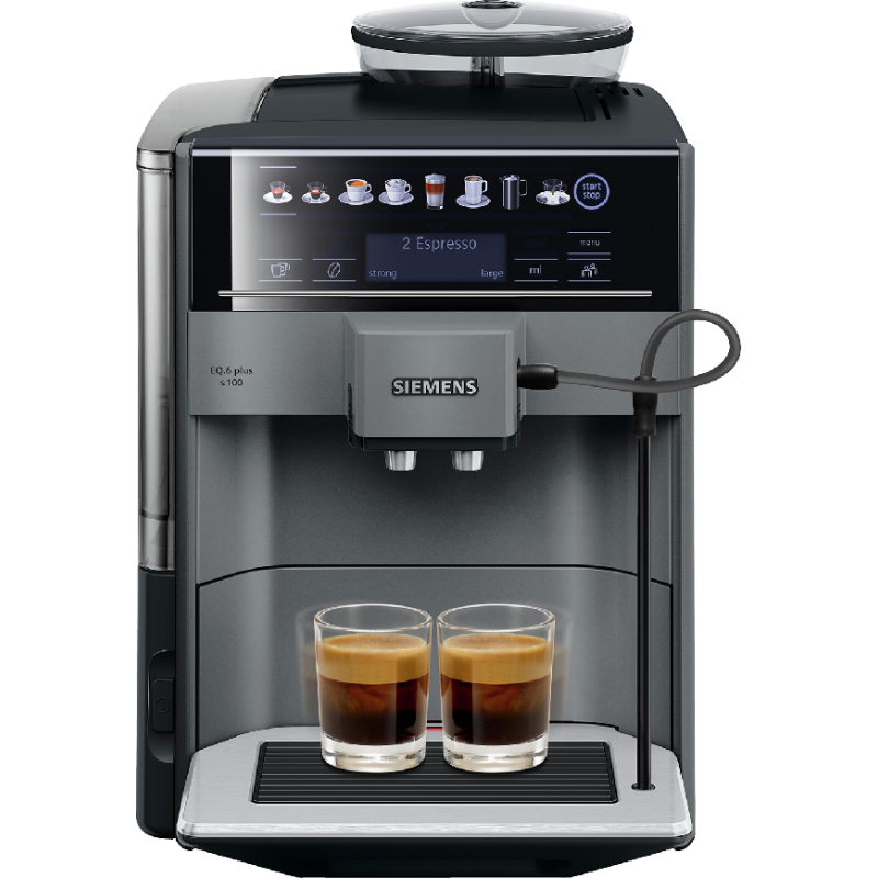De Siemens EQ.6 Plus s100 TE651209RW is een zwarte, volautomatische espressomachine voor het bereiden van een brede keuze aan koffie- en melkspecialiteiten.
