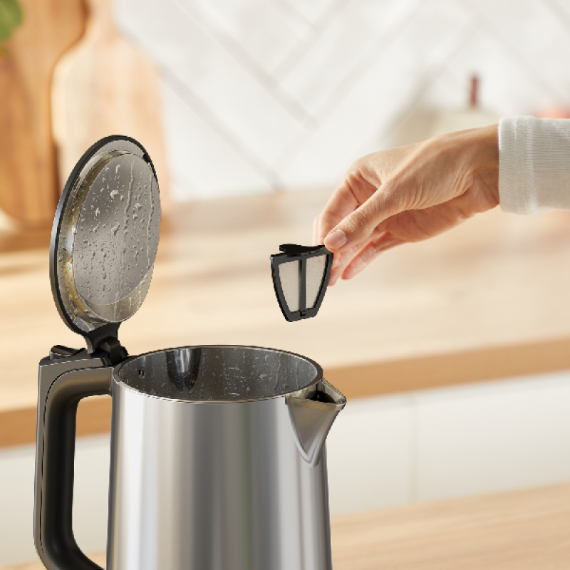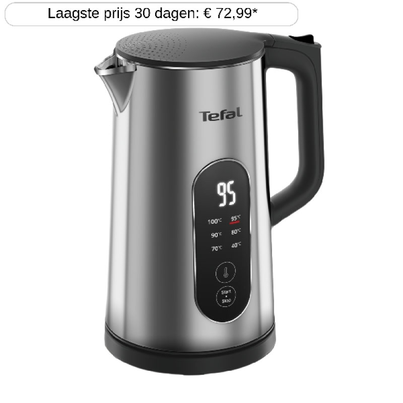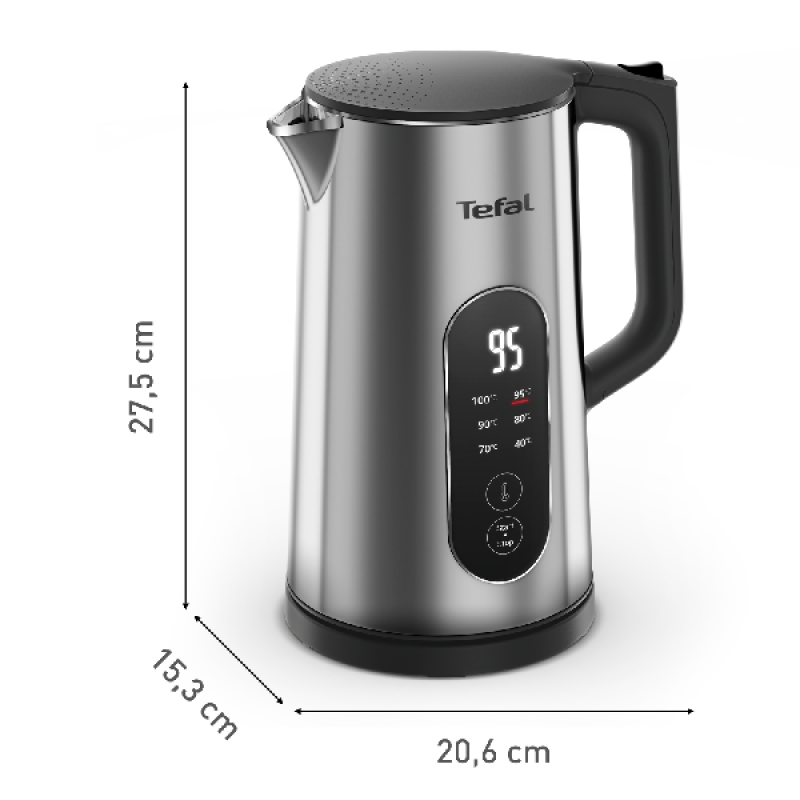 De waterkoker KI871D Selection van Tefal in Inox (RVS) biedt een praktische en veelzijdige oplossing voor het bereiden van heet water thuis. Met 6 nauwkeurige temperatuurstanden van 40 tot 100°C kun je eenvoudig koffie, thee of andere dranken bereiden op de gewenste temperatuur. Dankzij het realtime display zie je precies hoe warm het water is, en de warmhoudfunctie van 30 minuten houdt het water langer op temperatuur. De waterkoker heeft een inhoud van 1,7 liter, een uitneembaar antikalkfilter, automatische uitschakeling en beveiligde verwarmingselementen voor extra veiligheid. Het ontwerp met thermobehuizing zorgt dat de buitenkant koel blijft. Tot slot heeft de waterkoker een geïntegreerde kabelopwikkeling voor netjes opgeborgen snoer, een 360° voetstuk waarmee je de kan van elke kant kunt plaatsen, en is dit duurzame apparaat 15 jaar repareerbaar via het wereldwijde Tefal-netwerk, zodat je er lang plezier van hebt.