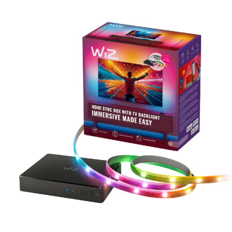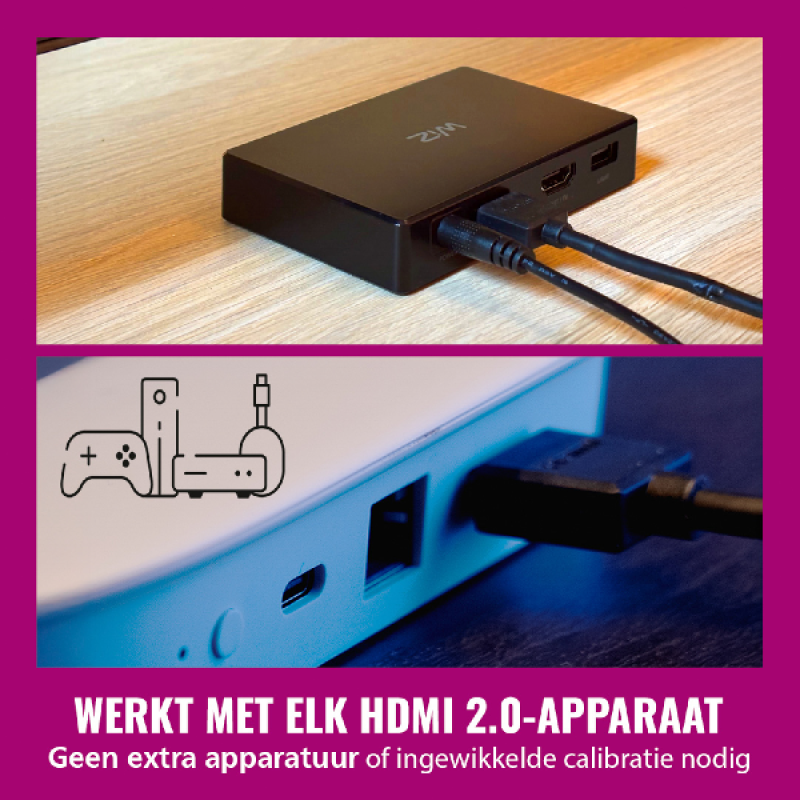 Je filmavonden en gamesessies zullen nooit meer hetzelfde zijn dankzij de WiZ Sync Box! Ervaar hoe de lichten dynamisch reageren met de kleuren die op je scherm te zien zijn, waardoor de kamer meekleurt en je nóg meer wordt ondergedompeld in de actie van de TV. Door de eenvoudige installatie van de Sync Box met HDMI aansluiting kun je direct genieten van deze nieuwe ervaring. De HDMI aansluiting zorgt voor nauwkeurig matchende kleuren en snelle reacties waardoor de LED strip de diverse dynamische kleuren tegelijk van je beeldscherm versterkt. Je kunt alle HDMI 2.0 apparaten op de Sync Box aansluiten, zoals gameconsoles, mediaspelers of andere streaming appraten. Je kunt zelfs meerdere WiZ lampen laten synchroniseren, zolang deze zijn aangesloten op het juiste Wifi netwerk.