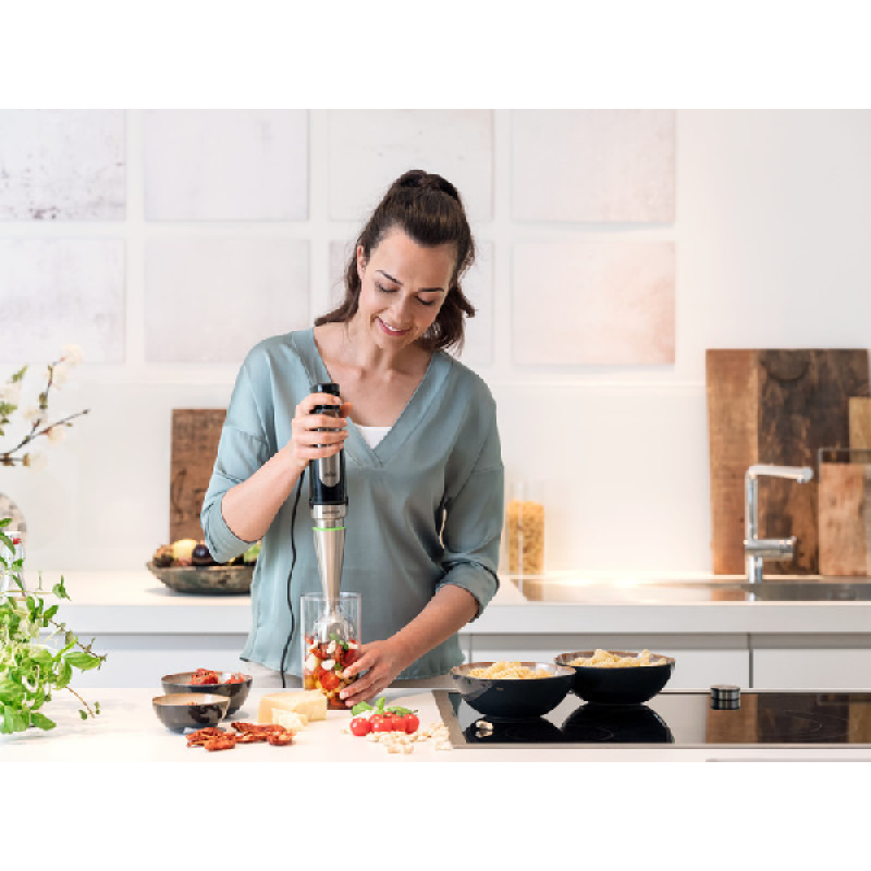 De MQ7035XBI is uitgerust met de innovatieve ActiveBlade-technologie, waarbij de messen op en neer bewegen voor een groter snijoppervlak en moeiteloos blenden van harde ingrediënten. De Easy SmartSpeed-technologie zorgt voor intuïtieve snelheidsregeling: hoe harder je drukt, hoe meer vermogen je krijgt. Zo pas je de snelheid naadloos aan op de gewenste consistentie. Met de meegeleverde accessoires, zoals de hakmolen en dubbele klopper, kun je eenvoudig hakken, kloppen en mixen, wat de veelzijdigheid vergroot.