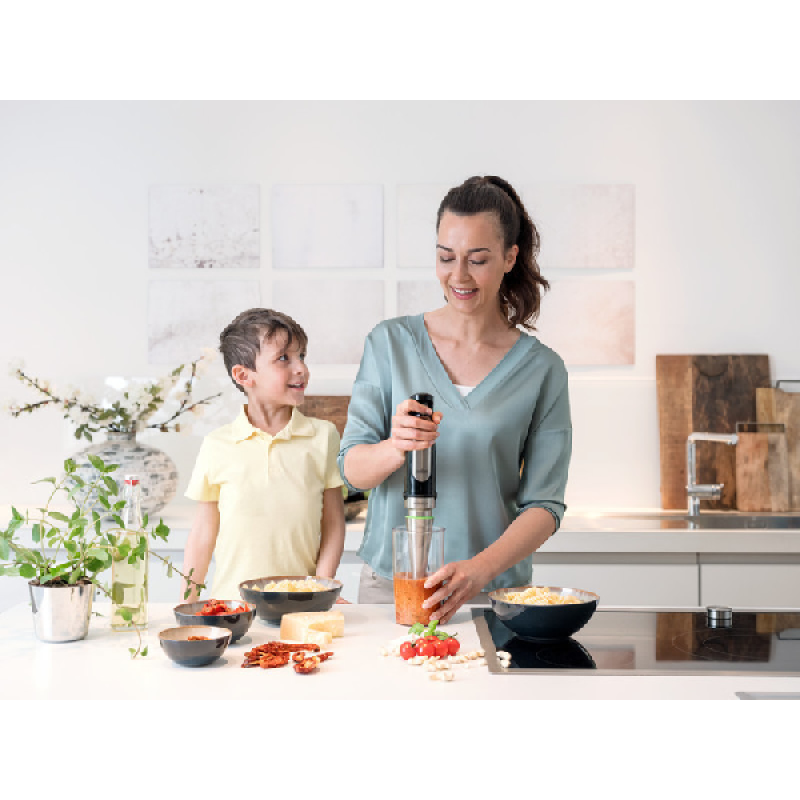 Met een krachtige 1.000W motor levert de MQ7035XBI indrukwekkende prestaties voor al je culinaire creaties. Of je nu smoothies, soepen of sauzen maakt, deze staafmixer zorgt voor snelle en gelijkmatige resultaten. De PowerBell Plus-technologie met extra hakmes maakt het blenden van harde ingrediënten extra efficiënt. Dankzij de SplashControl-technologie blijft je keuken schoon doordat spatten voorkomen worden.
