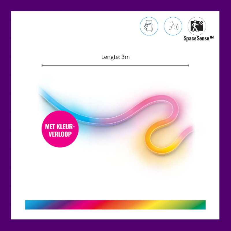 Creëer een gezellige sfeer in je huis met deze slimme WiZ-lichtstrip van 3 meter. De neonstrip is lekker flexibel, zodat je hem eenvoudig plaatst waar en hoe jij wilt. Maak bijvoorbeeld leuke vormen of plaats hem langs de rand van je meubilair om je interieur op te fleuren. De slimme ledstrip biedt verloopeffecten en maar liefst 16 miljoen kleuren licht, dus er is altijd wel een tint die bij je past. Verbind de lichtstrip simpelweg met je wifinetwerk en bedien alle handige functies heel gemakkelijk met de WiZ-app, de WiZ-afstandsbediening of je stem.