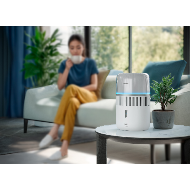 De HU5710/00-luchtbevochtiger heeft een ruim waterreservoir van 4,5 liter: genoeg om de lucht in kamers tot 56 m² te bevochtigen. Bovendien biedt het apparaat 3 ventilatorsnelheden en 8 luchtvochtigheidsniveaus van 30% tot 70%. Een fijne nevel wordt gelijkmatig verspreid zonder dat er druppels rond het apparaat ontstaan. NanoCloud-technologie zorgt bovendien voor luchtbevochtiging met tot wel 99% minder bacteriën dan ultrasone bevochtigers. Zo haal je pas echt opgelucht adem! En dat geldt ook voor het energieverbruik van dit stijlvol vormgegeven apparaat. Met maximaal 8 watt is het verbruik vergelijkbaar met een ledlamp. Wel zo fijn voor je energierekening én het milieu!