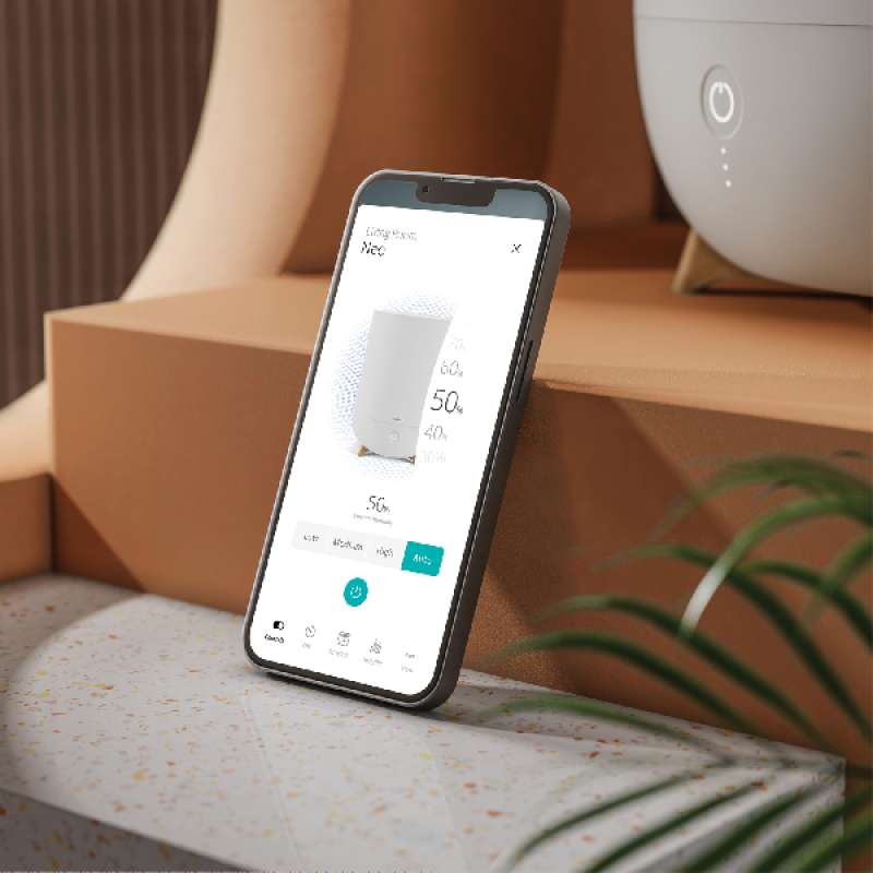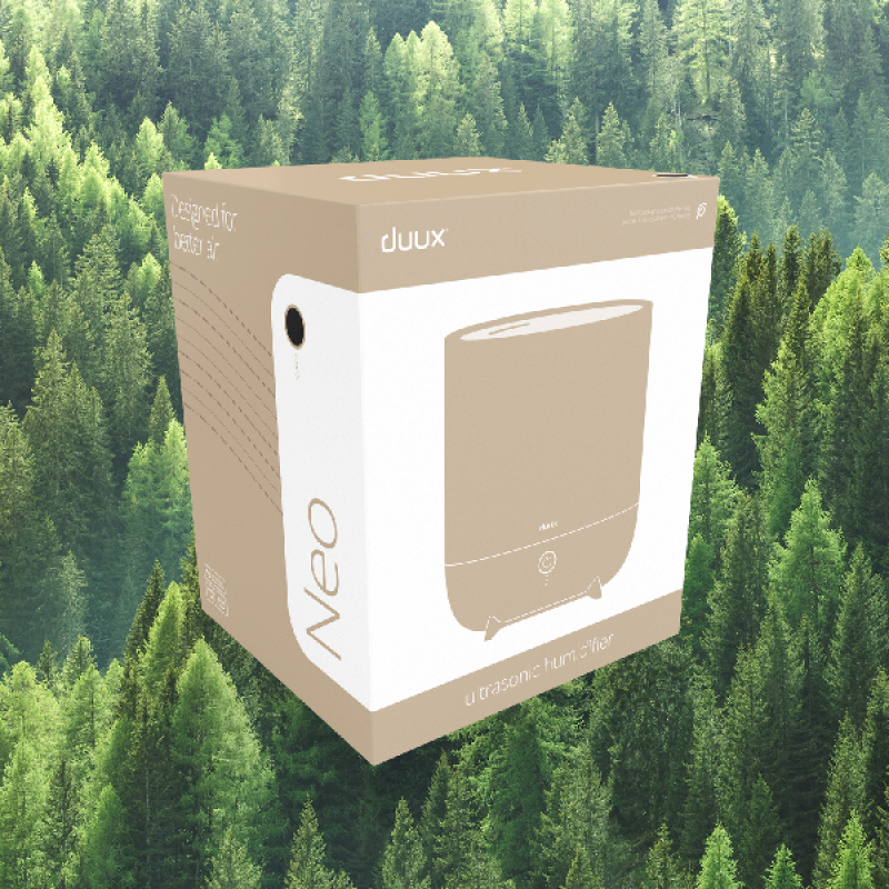 De Neo Smart beige ultrasone luchtbevochtiger van Duux is een klein apparaat dat discreet in je huis staat en je huis aangenamer maakt om in te wonen. Naast een eigentijds design heeft het ook een watertank van 5 l met een debiet van 500 ml/u, waardoor het ideaal is voor zowel kleine als grote ruimtes. Hij werkt op netstroom maar verbruikt zeer weinig energie. De Neo Smart is ontworpen om gemakkelijk te repareren voor een grotere duurzaamheid en beschikt ook over ultrasone technologie. Hij verspreidt geluidloos een lichte nevel om je huis te bevochtigen. Dus je kunt afscheid nemen van te droge lucht en de kloofjes die daarmee gepaard kunnen gaan.