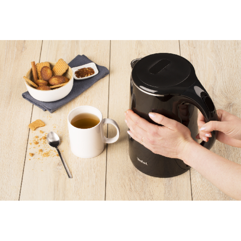 De Tefal Safe’Tea KO2608 waterkoker heeft een dubbele isolatiewand waardoor deze veilig aan te raken is aan de buitenkant. De buitenlaag is van kunststof en geleidt daarom geen warmte, waardoor je de waterkoker gewoon vast kunt pakken zonder je handen te branden. De binnenkant van de waterkoker is gemaakt van roestvrij staal en houdt het water langdurig warm. Deze waterkoker heeft wel 1800 watt aan vermogen, waardoor je niet lang hoeft te wachten tot het water kookt. De waterkoker kan 360° draaien op de voet en blijft stevig op zijn plaats staan. Dankzij de inhoud van wel 1,7 liter kan je veel water in één keer koken. De waterkoker beschikt daarnaast over een controlelampje met automatische uitschakeling, en is eenvoudig schoon te maken.