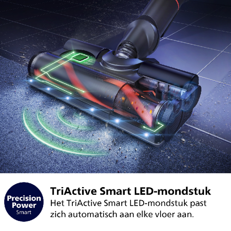 Het PrecisionPower-mondstuk herkent automatisch harde en zachte vloeren en past de luchtstroom en de draaisnelheid van de borstels hierop aan. Hierdoor reinigt het mondstuk tot 99,9% van stof en vuil in één slag. Daarnaast gaat het mondstuk strak langs je plinten en in hoeken zodat je alles goed bereikt en geen vuiltje overslaat. Kom je een wel erg hardnekkige vlek tegen, of zijn je vloeren gewoon toe aan dweilbeurt? Dan bevestig je eenvoudig de Aqua-module. Met deze module verwijder je tot wel 99% van de bacteriën van je vloer.