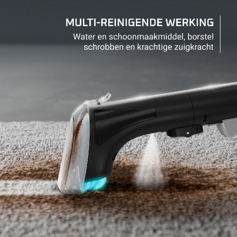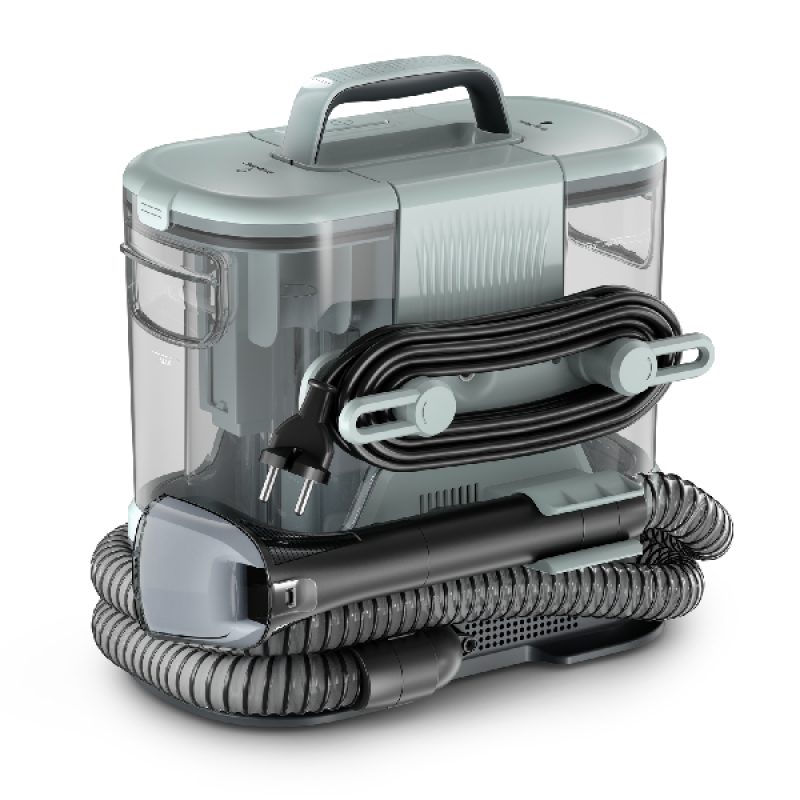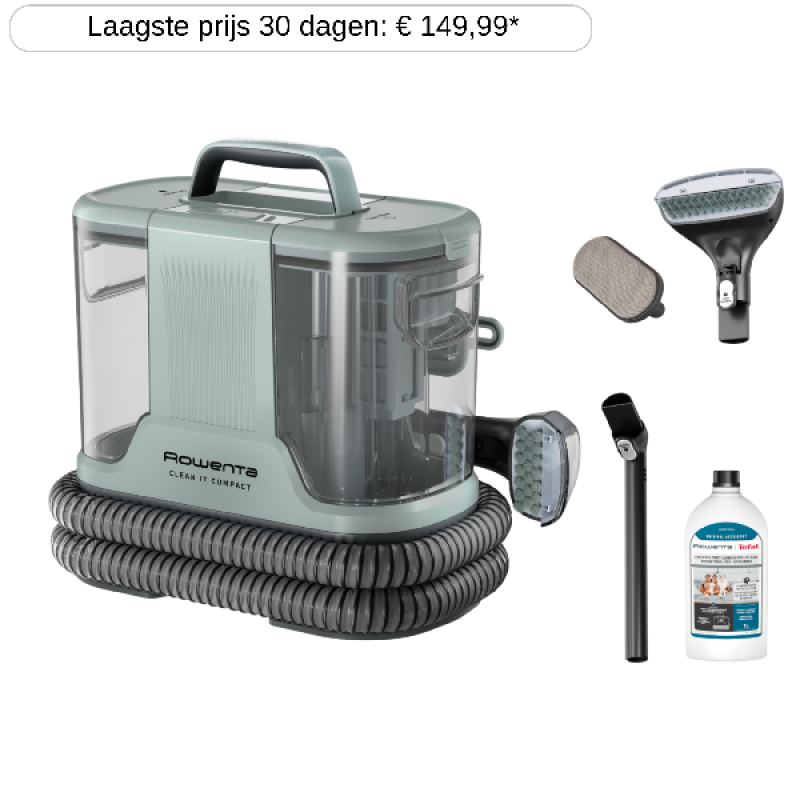 De Clean It Compact IN3020 tapijtreiniger van Rowenta in eucalyptus verwijdert vlekken en vuil uit tapijt, bekleding en auto-interieurs. Met 400 watt vermogen, een schoonwatertank van 1,4 liter en een vuilwatertank van 0,85 liter pak je zowel kleine ongelukjes als hardnekkige huisdierenvlekken aan. De combiborstel werkt op tapijt én harde vloeren, terwijl de afneembare sproeikop gericht reinigen mogelijk maakt. Dankzij het zelfreinigende accessoire blijft onderhoud beperkt en met de netsnoerlengte van 4 m heb je voldoende bewegingsvrijheid. Zo krijg je een compacte, gebruiksvriendelijke oplossing die doelgericht reinigt zonder stoomfunctie, volgens de specificaties van de fabrikant.