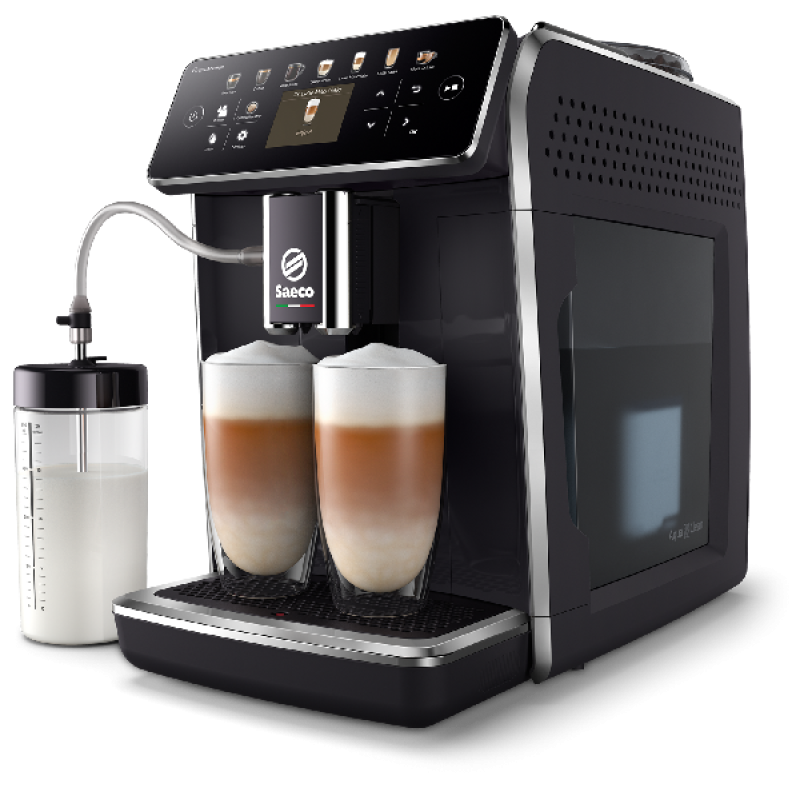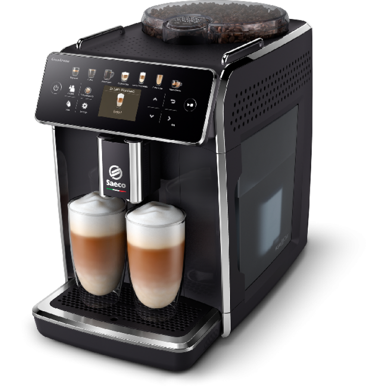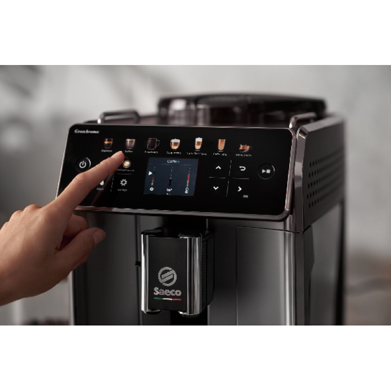 De Saeco GranAroma SM6580/00 is een volautomatische espressomachine met een strak glanzend zwart ontwerp dat in elke moderne keuken past. Met een bonenreservoir van 300 gram en een waterreservoir van 1,8 liter kun je meerdere kopjes koffie zetten zonder steeds te hoeven bijvullen. Het melkreservoir van 0,6 liter is handig voor het bereiden van melkspecialiteiten, zoals cappuccino’s en latte macchiato’s. De machine is uitgerust met een duurzame keramische molen, wat zorgt voor een optimale aroma- en smaakextractie. Tot slot zet je met een druk op het intuïtieve TFT-display zowel een enkele als dubbele kop koffie.