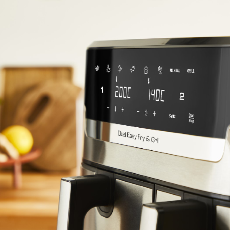 Grill en luchtfrituur diverse ingrediënten tegelijkertijd met de Tefal EY905D Dual Easy Fry & Grill XXL. Deze airfryer is uitgerust met dubbele lades waarmee je een complete maaltijd of afzonderlijke gerechten in één keer bereid. Met een totale XXL-capaciteit van 8,3 liter maak je eindeloze maaltijden voor het gezin of gasten klaar. De heteluchtfriteuse heeft 8 automatische programma’s, waaronder groenten, dessert, dehydratie en grill. Het is ook mogelijk om zelf de temperatuur (tot 200 °C) en de bereidingstijd in te stellen voor nauwkeurige controle. Met dit ruime aanbod heb je alles wat je nodig hebt om een lekkere, olie-arme maaltijd op tafel te zetten. Dankzij Extra Crisp-technologie geniet je bovendien extra krokante resultaten. Voorverwarmen is bij deze friteuse niet nodig. Dit apparaat is dan ook zeer geschikt voor mensen een drukke levensstijl. Na gebruik reinig je de frituurmand met anti-aanbaklaag, het XXL-grillrooster en het normale rooster eenvoudig in de vaatwasmachine.