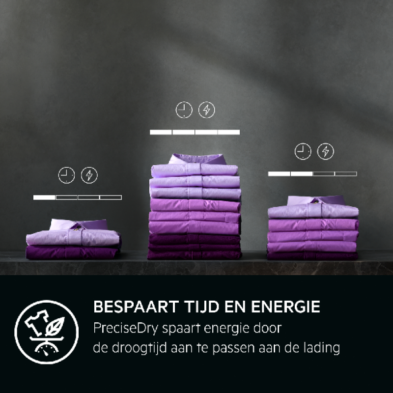 Geniet van uitstekende droogresultaten met de AEG TR738AT4B 7000 serie SensiDry-warmtepompdroger. In dit zuinige model droog je tot 8 kilo wasgoed per keer. Vaak duren programma’s van warmtepompdrogers langer, maar met de SensiDry-technologie van AEG is dat niet het geval. Droogprogramma’s duren niet onnodig lang en de temperatuur wordt laag gehouden. Dat drukt niet alleen de energiekosten, maar zorgt er ook voor dat jouw wasgoed niet aan onnodige hitte wordt blootgesteld. Dat is dus goed voor de portemonnee en voor je kleding. Om het energieverbruik nog verder te drukken, past PreciseDry de droogtijd aan op basis van de lading. Het loont zich dus om ook kleinere hoeveelheden was te drogen. Bovendien heb je keuze uit 10 programma’s, zodat je altijd de juiste behandeling kiest voor wat je die dag hebt gewassen.