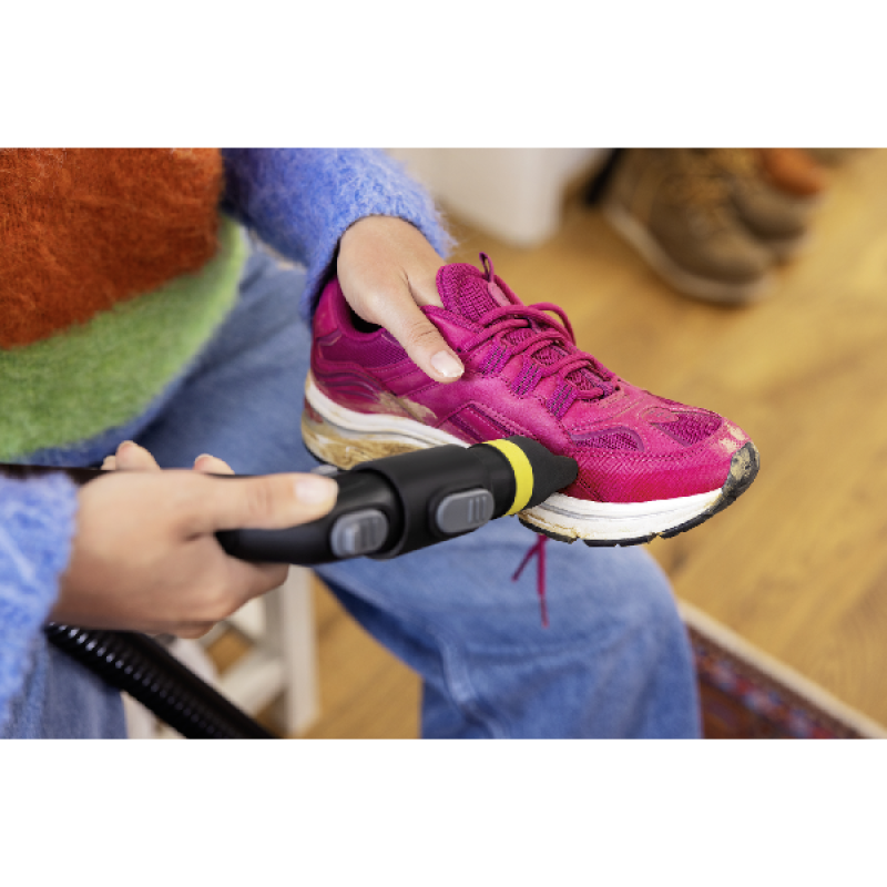 De Kärcher Shoe!Cleaner is het ideale accessoire om al je schoenen gemakkelijk en effectief schoon te maken met je SE 3, 4, 5 of 6 reiniger. Dankzij het innovatieve druppelvrije systeem zorgt hij voor een nauwkeurige reiniging zonder spatten, voor altijd een perfect resultaat. Makkelijk te bevestigen en te gebruiken, hij past perfect op verschillende soorten schoenen: sneakers, nette schoenen en sportschoenen. Licht en compact, dit accessoire garandeert een snelle, grondige reiniging zonder moeite. Met de Shoe!Cleaner verzorg je je schoenen en verleng je eenvoudig hun levensduur.