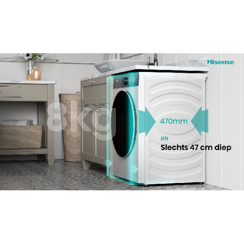 (+) Ruimtebesparend ontwerp: dankzij de diepte van slechts 47 cm past deze wasmachine perfect in kleinere ruimtes zonder in te boeten op capaciteit.