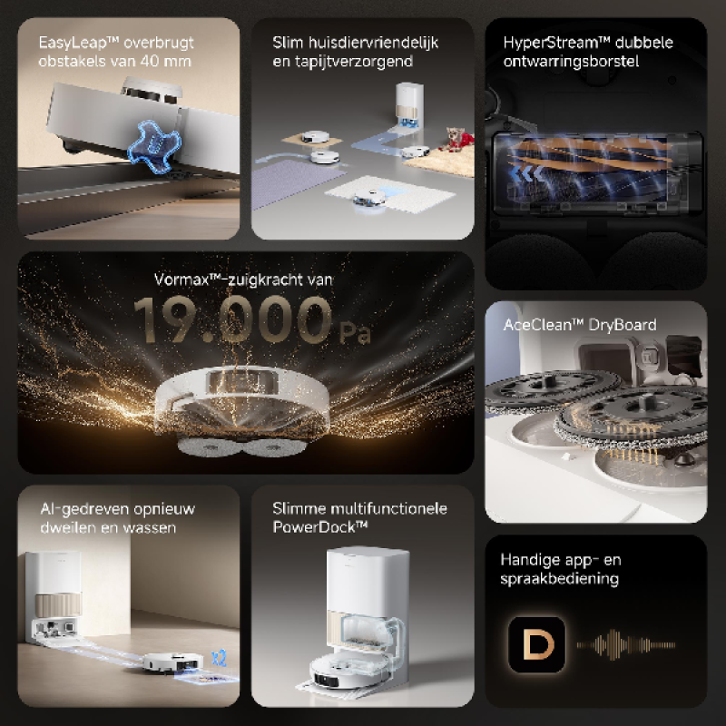 Na elke schoonmaakbeurt doet de PowerDock de rest. Hij leegt automatisch de stofbak, reinigt en wast de dweil met heet water (75 °C) en verwijdert zo bacteriën en nare geurtjes. De AceClean DryBoard-technologie houdt de dweilpads fris, terwijl de reservoirs van 4,5 liter (schoon water) en 4,0 liter (vuil water) lange cycli mogelijk maken zonder bijvullen. De bediening verloopt eenvoudig via de app of spraakcommando. De Dreame L40s Pro Ultra combineert krachtige reiniging met volledige autonomie. Jij leunt achterover, hij doet de rest. Kortom, jouw slimme partner voor glanzend schone en gedweilde vloeren.
