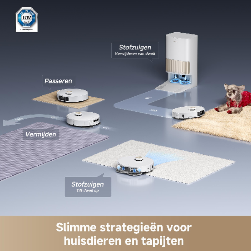 (+) Slimme navigatie: dankzij Pathfinder AI-navigatie en EasyLeap-drempelherkenning beweegt de robot soepel door je huis en overwint obstakels tot 40 mm.