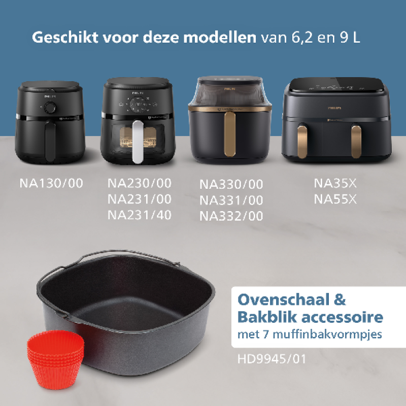 Met de HD9945/01 Airfryer XL-accessoireset van Philips breid je jouw airfryer uit om je favoriete bakrecepten te bereiden. De meesterbakker-kit bestaat onder andere uit een niet-klevend bakaccessoire voor taarten en brood. Daarnaast kun je hierin ook gerechten bereiden, zoals stamppot en lasagne. Muffins maak je snel en eenvoudig met de meegeleverde siliconen Airfryer-muffinvormpjes. Doordat de siliconen vormpjes geurloos zijn, gebruik je deze keer op keer opnieuw. Ook krijg je een boekje vol met inspiratietips en baktijden voor de airfryer. De HD9945/01 Airfryer XL-accessoireset is vaatwasmachinebestendig, waardoor je alles eenvoudig reinigt.