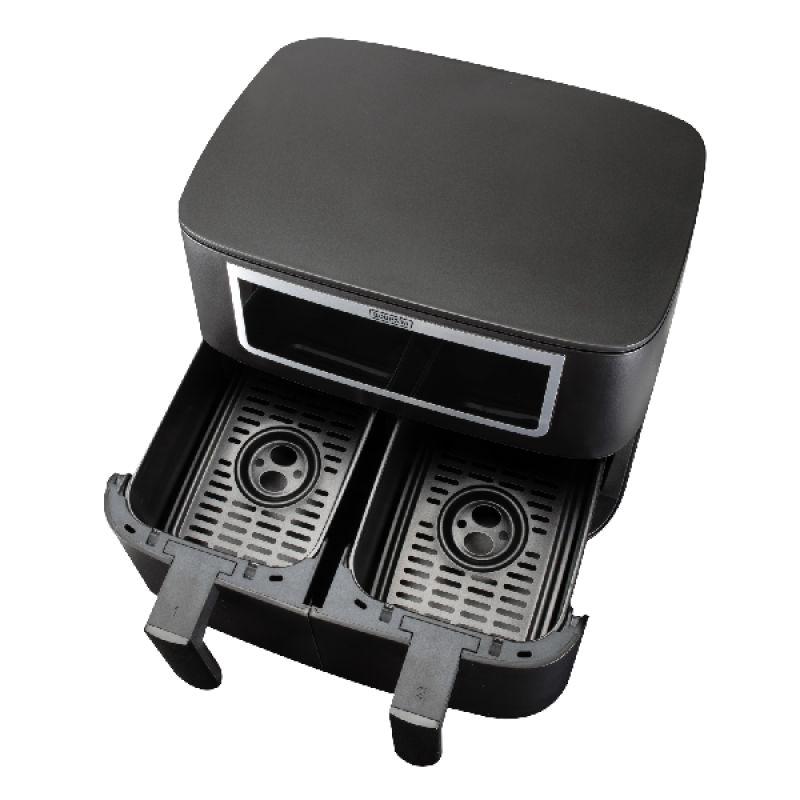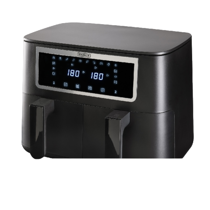 Ontdek de Bourgini Duo Health Fryer met zijn royale XXL-inhoud van 2 x 4.0 liter en koelblijvende behuizing. Dit veelzijdige keukenapparaat combineert een friteuse en heteluchtoven in één, zonder het gebruik van olie. Geniet van gezondere maaltijden met 65% minder vet door het bakken met hete lucht. Met deze airfryer frituur, grill, bak en braad je niet alleen gezonder, maar ook snel en vrijwel geurloos. Dankzij 2 afzonderlijk instelbare kooklades, bereid je verschillende gerechten of grote porties tegelijkertijd. De Match-functie synchroniseert kooktijden voor gelijktijdige maaltijden, terwijl de Sync-functie instellingen kopieert voor dubbel kookgemak. Het digitale bedieningspaneel heeft 10 snelkeuzeprogramma’s, een regelbare temperatuur (60 - 200°C) en instelbare timer (tot 60 minuten). Bovendien beschikt de Duo Health Fryer over een handige antiaanbaklaag en zijn de roosters vaatwasmachinebestendig voor eenvoudige reiniging.