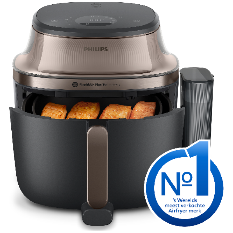 De Philips Airfryer 5000 Series NA547/07 in zwart met goudkleurige accenten combineert RapidAir Plus-technologie en een volwaardige stoomfunctie in één toestel. Zo kies je uit 21 kookmethodes, van airfryen, grillen en bakken tot stoven, fermenteren en konfijten. De SteamFry-functie laat hete lucht en stoom samenwerken, waardoor gerechten een krokante buitenkant krijgen terwijl de binnenkant sappig blijft. De temperatuur stel je in tussen 40 en 200 °C, terwijl de timer tot 24 uur loopt voor langzamere bereidingen. Het vermogen van 2.000 watt zorgt dat gerechten snel klaar zijn, zelfs tot 50% sneller dan in een traditionele oven en met tot 70% minder energieverbruik.