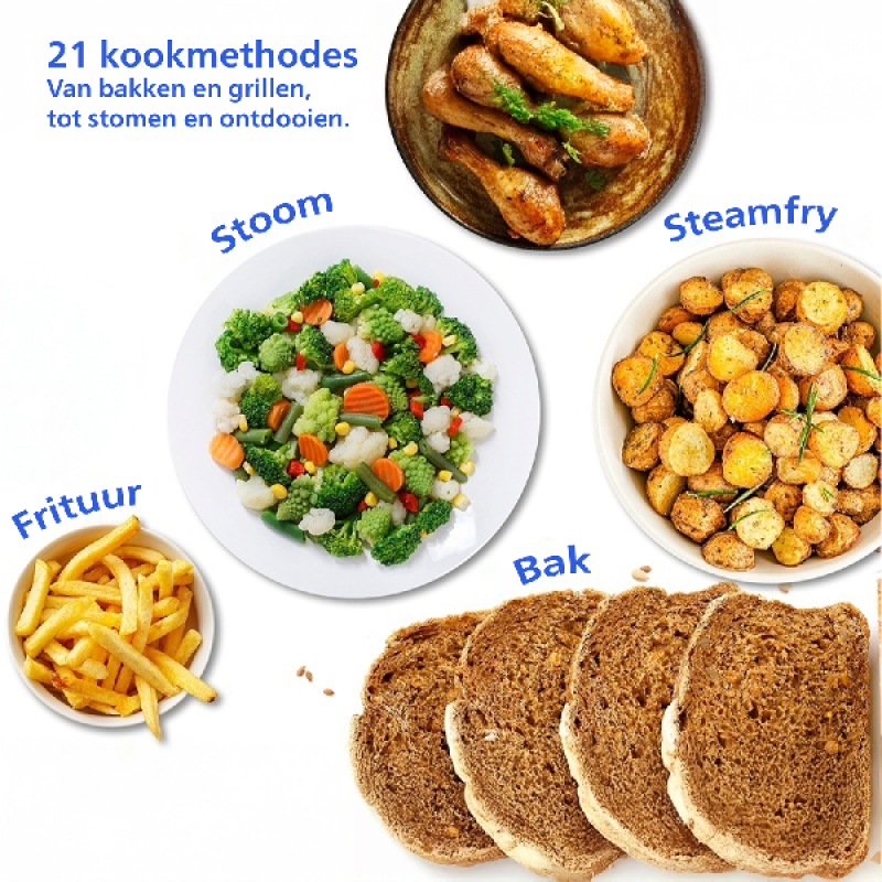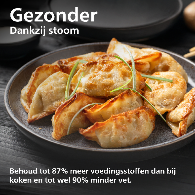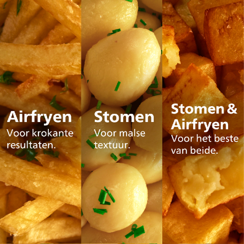 (+) Stomen en airfryen tegelijk: SteamFry-functie geeft knapperige buitenkant en sappige binnenkant in één bereiding.
