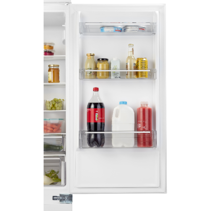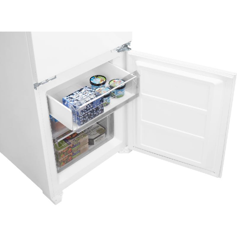 De ETNA KCS7178 inbouw koel-vriescombinatie heeft een strak wit design dat in diverse keukens past. Met een hoogte van 178 cm en een breedte van 54 cm is hij eenvoudig te integreren in je keukenmeubilair. De led-verlichting in het koelgedeelte zorgt voor een helder overzicht van je producten. De glazen legplateaus met lekrand en transparante groentelades maken de indeling overzichtelijk en praktisch. Het sleepdeursysteem draagt bij aan een nette afwerking en makkelijke installatie.