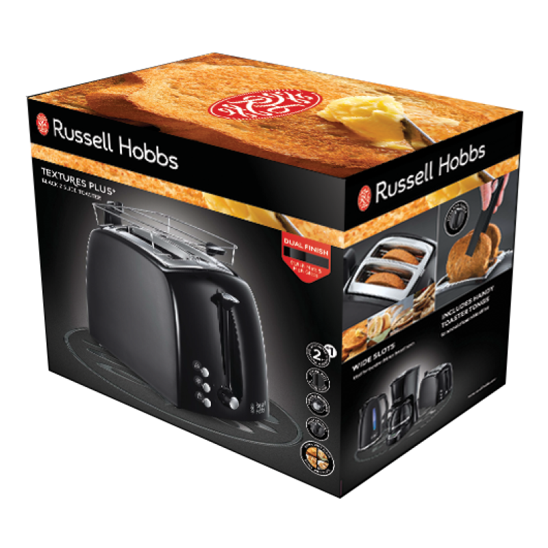 Het Russell Hobbs Textures Plus Broodrooster is een praktisch broodrooster met een stijlvol, volledig zwart design. Dit broodrooster heeft verschillende handige functionaliteiten. Zo beschikt hij over een ontdooifunctie waardoor je brood dat uit de vriezer komt direct kunt roosteren, zijn de broodsleuven extra breed zodat je er dikke boterhammen en broodjes mee kunt roosteren en heeft hij een handig warmhoudrooster. Het Russell Hobbs Textures Plus Broodrooster heeft daarnaast variabel instelbare bruiningsstanden waardoor je kunt aangeven hoe knapperig hij je brood moet toasten.