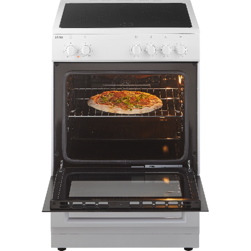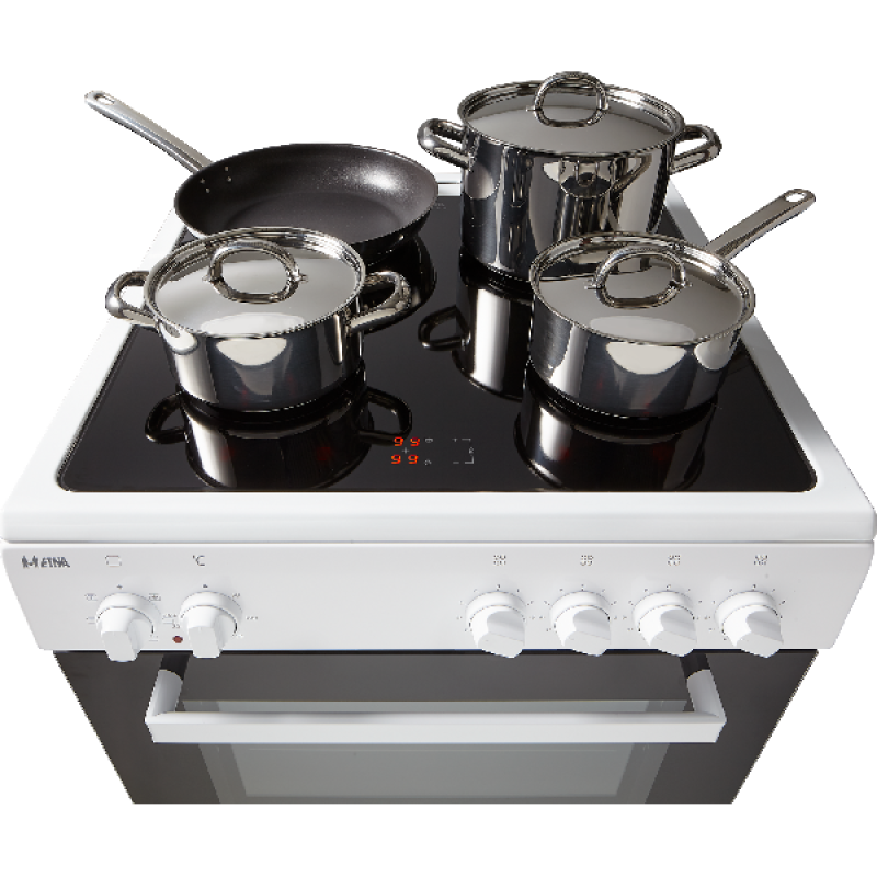 De Etna FIV560WIT is een 60 cm breed 4-pits inductiefornuis met een elektrische oven. De kookzones bedien je eenvoudig met draaiknoppen en beschikken over 10 kookstanden inclusief boostfunctie. Ook is dit model voorzien van Virtual Pan Support. Dit design helpt bij het optimaal positioneren van de pan waardoor je het maximale vermogen uit je kookplaat haalt. De ruime multifunctionele oven is voorzien van hetelucht, boven- en/of onderwarmte en beschikt daarnaast ook over een grill en verlichting. Met een oveninhoud van 65 liter is er voldoende ruimte voor pizza’s, taarten en heerlijke ovenschotels. Dankzij de geëmailleerde ovenruimte en de vlakke glazen ovendeur is ook het schoonmaken snel gedaan. Het fornuis is geschikt voor een 2-fasen aansluiting.