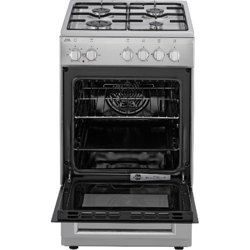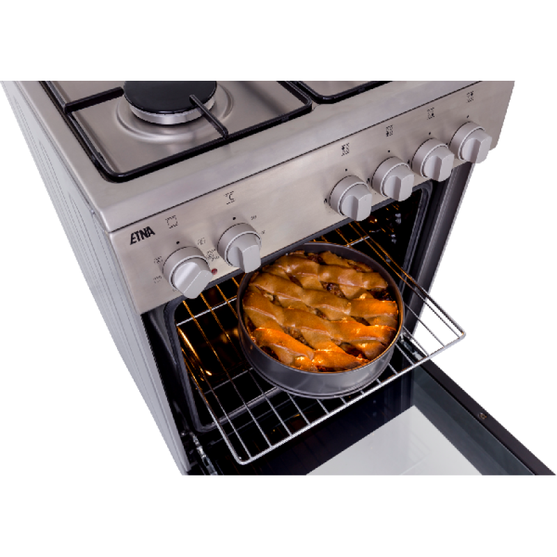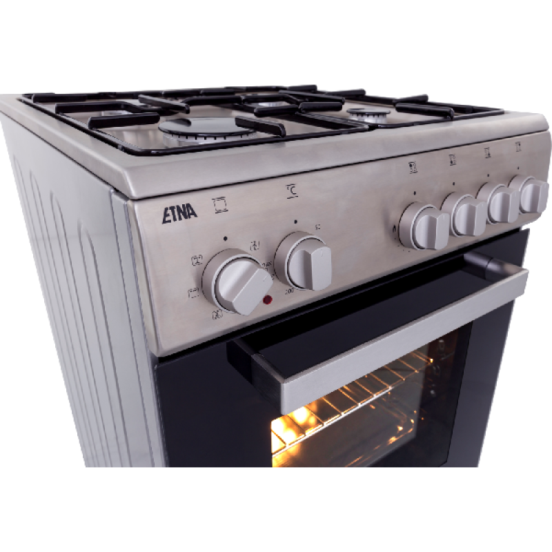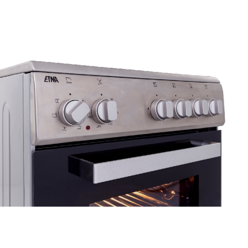 Koken met de ETNA FGV350RVS is door de geïntegreerde vonkontsteking een kwestie van drukken en draaien. Mocht de vlam tijdens het gebruik toch per ongeluk uitwaaien, dan wordt het gas automatisch afgesloten. Buiten de vlambeveiliging is de ovendeur voorzien van dubbel glas en dat maakt zorgeloos koken iets vanzelfsprekends. Een bevroren stuk vlees of groenten is dankzij de ontdooifunctie te ontdooien met behoud van smaak en textuur. Het unieke aan het ETNA-fornuis FGV350RVS is de compacte afmeting. Doordat het fornuis slechts 50 cm breed is en 50 liter inhoud heeft, past hij goed in smallere keukens. Zelfs met deze ranke afmetingen biedt de FGV350RVS alle veelgevraagde tools en functies zoals hetelucht, grillen en ontdooien.