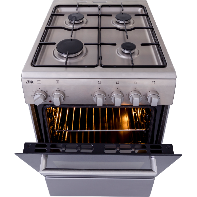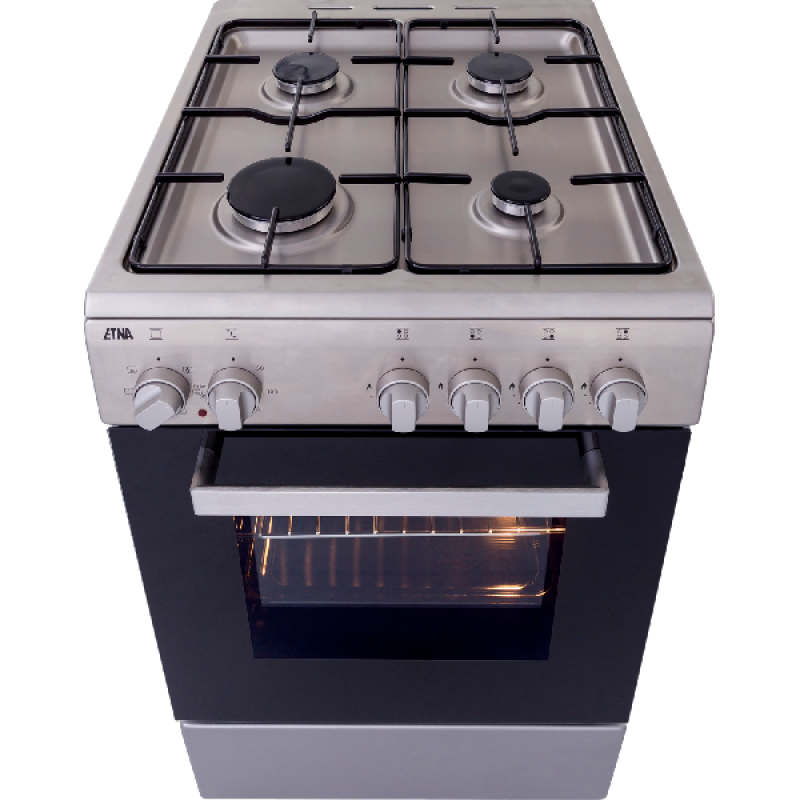 Koken met de ETNA FGV350RVS is door de geïntegreerde vonkontsteking een kwestie van drukken en draaien. Mocht de vlam tijdens het gebruik toch per ongeluk uitwaaien, dan wordt het gas automatisch afgesloten. Buiten de vlambeveiliging is de ovendeur voorzien van dubbel glas en dat maakt zorgeloos koken iets vanzelfsprekends. Een bevroren stuk vlees of groenten is dankzij de ontdooifunctie te ontdooien met behoud van smaak en textuur. Het unieke aan het ETNA-fornuis FGV350RVS is de compacte afmeting. Doordat het fornuis slechts 50 cm breed is en 50 liter inhoud heeft, past hij goed in smallere keukens. Zelfs met deze ranke afmetingen biedt de FGV350RVS alle veelgevraagde tools en functies zoals hetelucht, grillen en ontdooien.
