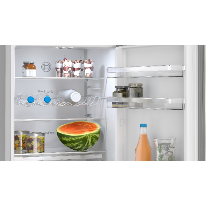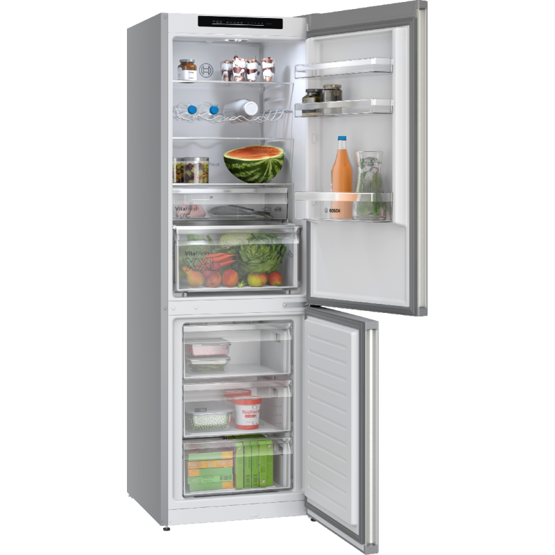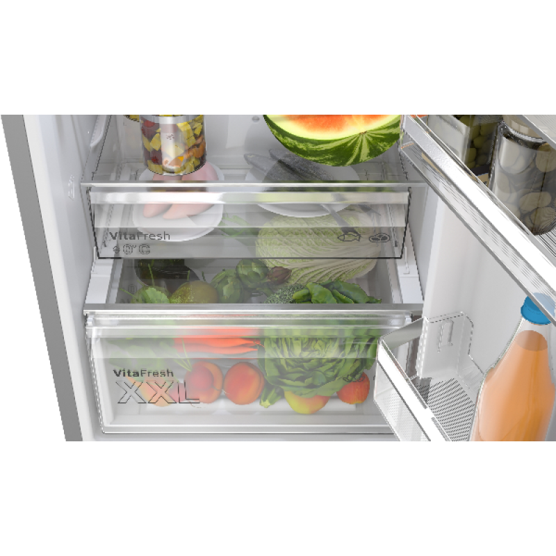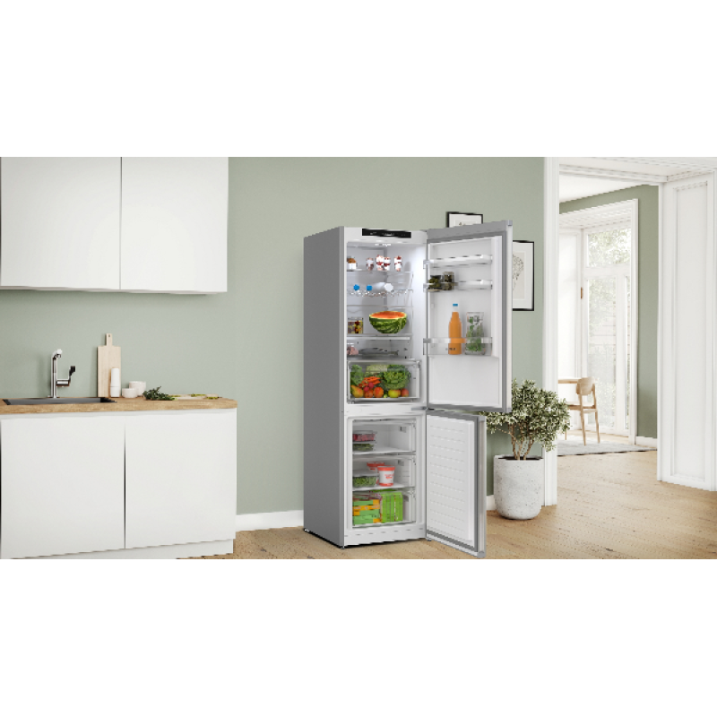 Deze stijlvolle, zuinige en ruime KGN362LAF koel-vriescombinatie van Bosch is een topkeuze voor wie 2 apparaten in een wil hebben! Deze zilverkleurige vrijstaande koelkast met vriesvak is een echte eyecatcher én een slimme hulp in de keuken. Met z’n royale inhoud van 321 liter (218 l koelkast + 103 l vriezer) heb je plek zat voor al je verse en bevroren ingrediënten, snacks en diepvriespizza’s. Dankzij NoFrost hoef je nooit meer te krabben of te ontdooien. De led-verlichting met Soft Start zorgt voor een sfeervol overzicht van je voorraad. De koelkast is voor zien van 2 VitaFresh-lades (waarvan 1 XXL) om je fruit, groenten extra lang vers te houden, en met de Super-koelstand zijn je nieuwe boodschappen razendsnel op temperatuur. Bovendien is hij fluisterstil (slechts 33 dB), en energiezuinig (label A). Kortom: strak, slim en superpraktisch!