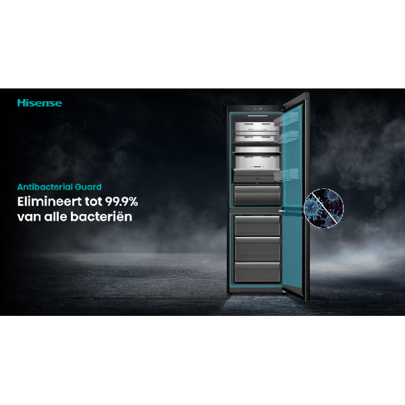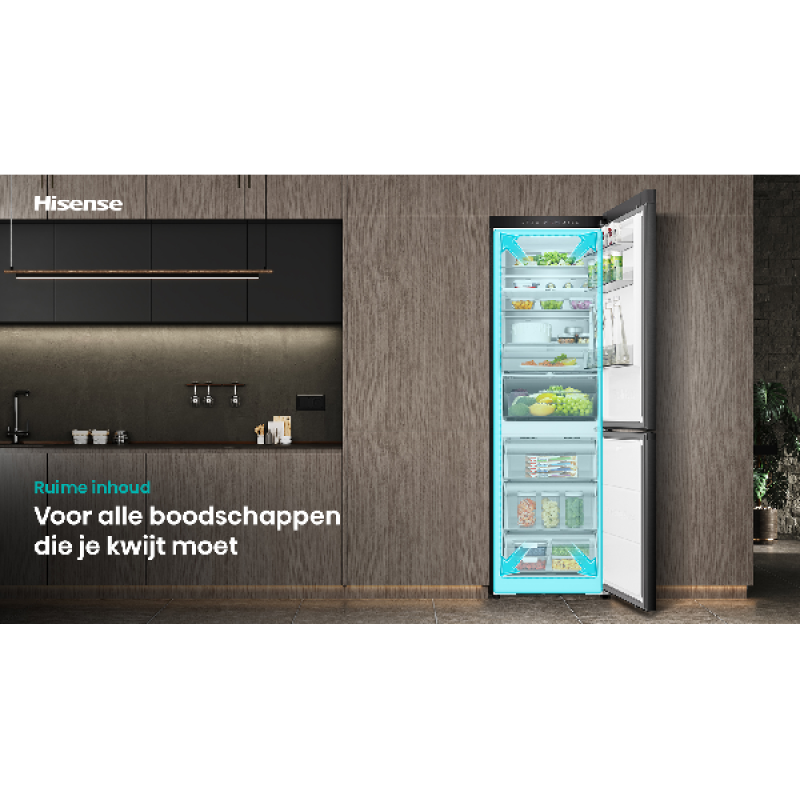 De Hisense RB5K330GSFC koel-vriescombinatie in stijlvol zwart biedt een totale nettocapaciteit van 330 liter, verdeeld over een koelgedeelte van 215 liter en een vriesgedeelte van 115 liter. Dankzij de No Frost-technologie is ijsvorming verleden tijd, terwijl het Multi Air Flow-systeem zorgt voor een gelijkmatige temperatuurverdeling. Met energieklasse C en een geluidsniveau van slechts 35 dB is deze koelkast zowel energiezuinig als stil. De LED-verlichting en het omkeerbare deurscharnier maken het gebruiksgemak compleet. Een ideale keuze voor een moderne keuken!