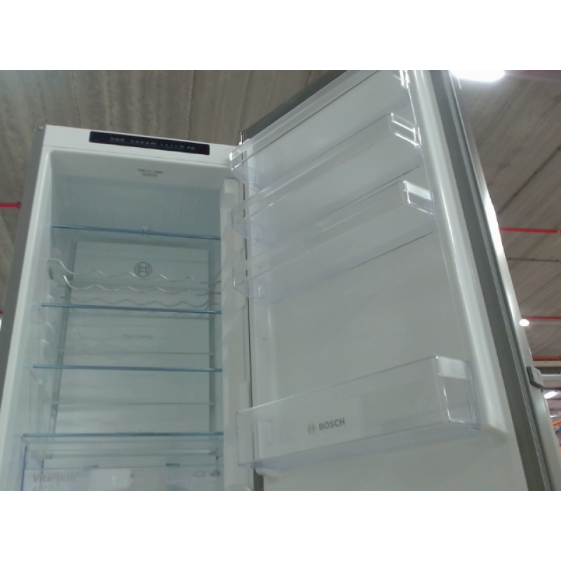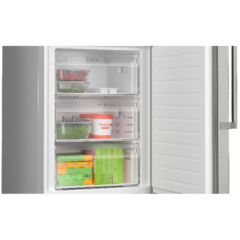 De Bosch KGN39VICT Serie 4 is een NoFrost koel-vriescombinatie die voorzien is van 2 aparte koelcircuits. Hierdoor is de temperatuur van de koel- en vrieszone afzonderlijk van elkaar te regelen. Ook wordt voorkomen dat er geuren en smaken overlopen tussen de twee zones. In de VitaFresh XXL 0°C-box blijft de temperatuur lager, waardoor vlees, vis, groente en ander vers voedsel langer vers blijft. Wanneer je nieuwe boodschappen in je koelkast wilt zetten, dan gaat er vaak veel kou verloren. Door het gebruik van superKoelen wordt dit snel opgelost. De koelkast verlaagt de temperatuur dan namelijk voor een bepaalde periode tot 2 graden, zodat ook de nieuwe boodschappen snel de juiste temperatuur bereiken. Met de automatisch SuperVriezen-functie vries je kleine etenswaren sneller in en wordt je ingevroren eten tegelijkertijd beschermd tegen ontdooien. De temperatuur blijft in heel de koelkast gelijk, omdat het multiAirflow-systeem de lucht gelijkmatig circuleert in het koelgedeelte. De Vario-omvormer werkt door zich aan te passen aan de temperatuurveranderingen binnen en buiten de koelkast en de belasting binnenin. Als de deur voor een lange tijd gesloten is, draait hij langzamer met een lager geluidsniveau en houdt het je eten op een optimale temperatuur. Ook biedt het optimale prestaties tijdens spanningsschommelingen. Dankzij de NoFrost-technologie hoef je de vriezer nooit meer te ontdooien. De koel-vriescombinatie heeft een mooie roestvrijstalen uitstraling waarop geen vingerafdrukken te zien zijn.