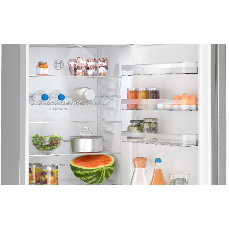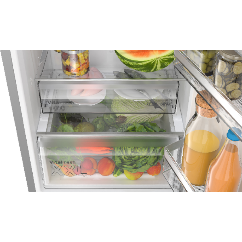 De Bosch KGN39VICT Serie 4 is een NoFrost koel-vriescombinatie die voorzien is van 2 aparte koelcircuits. Hierdoor is de temperatuur van de koel- en vrieszone afzonderlijk van elkaar te regelen. Ook wordt voorkomen dat er geuren en smaken overlopen tussen de twee zones. In de VitaFresh XXL 0°C-box blijft de temperatuur lager, waardoor vlees, vis, groente en ander vers voedsel langer vers blijft. Wanneer je nieuwe boodschappen in je koelkast wilt zetten, dan gaat er vaak veel kou verloren. Door het gebruik van superKoelen wordt dit snel opgelost. De koelkast verlaagt de temperatuur dan namelijk voor een bepaalde periode tot 2 graden, zodat ook de nieuwe boodschappen snel de juiste temperatuur bereiken. Met de automatisch SuperVriezen-functie vries je kleine etenswaren sneller in en wordt je ingevroren eten tegelijkertijd beschermd tegen ontdooien. De temperatuur blijft in heel de koelkast gelijk, omdat het multiAirflow-systeem de lucht gelijkmatig circuleert in het koelgedeelte. De Vario-omvormer werkt door zich aan te passen aan de temperatuurveranderingen binnen en buiten de koelkast en de belasting binnenin. Als de deur voor een lange tijd gesloten is, draait hij langzamer met een lager geluidsniveau en houdt het je eten op een optimale temperatuur. Ook biedt het optimale prestaties tijdens spanningsschommelingen. Dankzij de NoFrost-technologie hoef je de vriezer nooit meer te ontdooien. De koel-vriescombinatie heeft een mooie roestvrijstalen uitstraling waarop geen vingerafdrukken te zien zijn.
