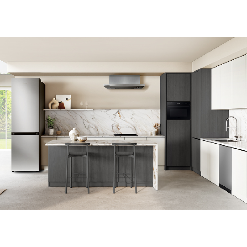 De Samsung RB38C607AS9 is een slimme koel-vriescombinatie met alle technische snufjes om zuinig en efficiënt te koelen. Hij heeft energielabel A, en dat komt onder andere door de slimme AI Energy Mode van de SmartThings-app (Samsung-account vereist). Deze helpt je actief om je energieverbruik zo laag mogelijk te houden. Dankzij de zeer effectieve maar toch flinterdunne isolatiewanden van SpaceMax profiteer je ook nog eens van meer ruimte zonder dat de koelkast zelf groter uitvalt. Ook met versproducten weet hij wel raad: de Optimal Fresh+- en Humidity Fresh-lades laten je zelf de luchtvochtigheid instellen: de eerste is desgewenst te verdelen in 2 zones voor verschillende soorten producten, en de tweede heeft een draaiknop waarmee je de luchtvochtigheid aanpast op basis van wat je wilt bewaren. En ontdooien? No Frost maakt dat overbodig.