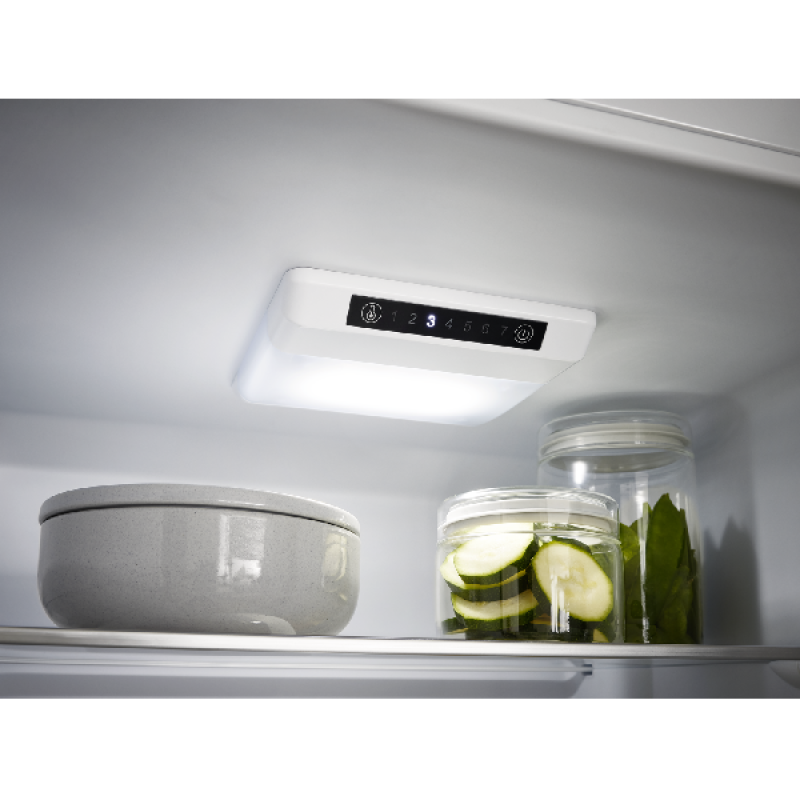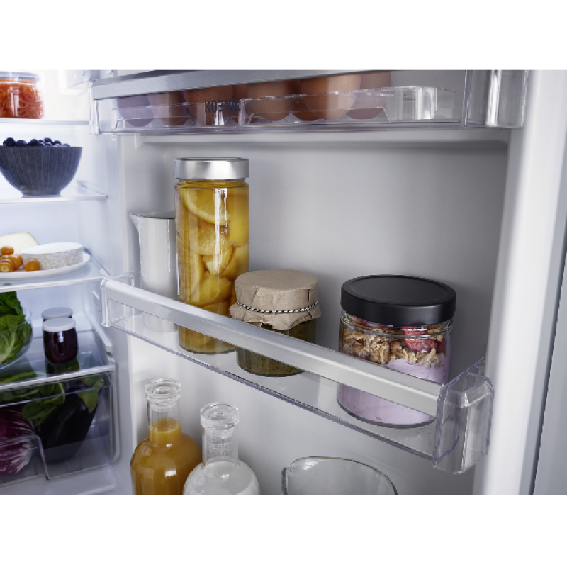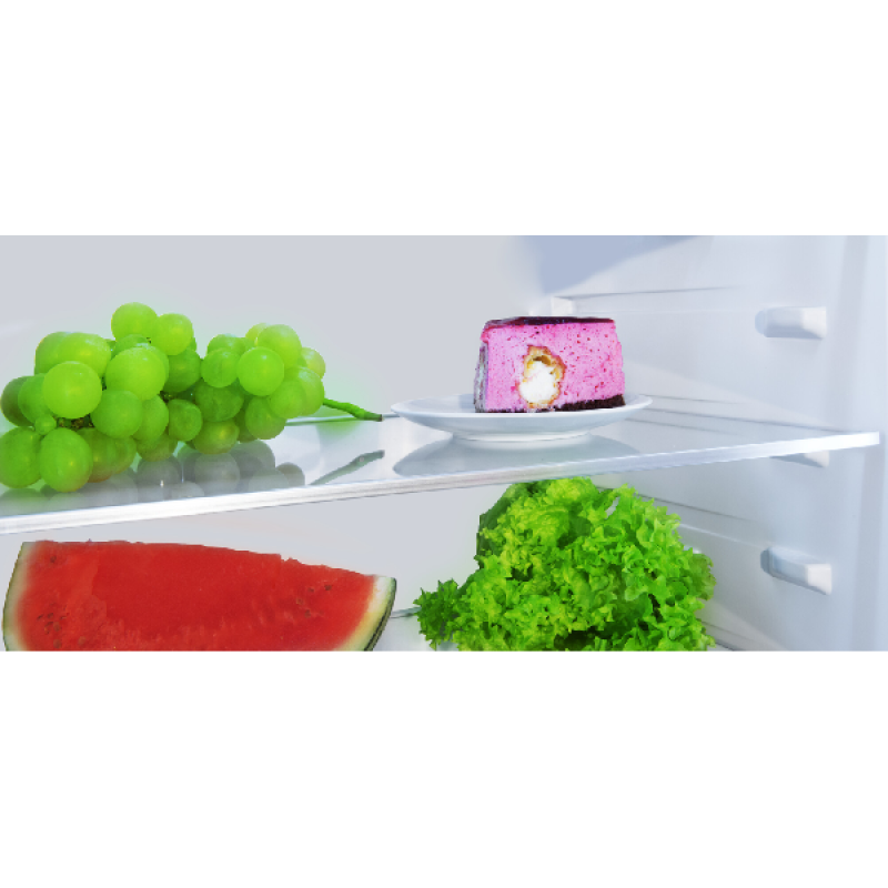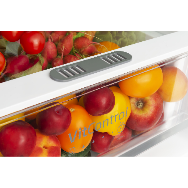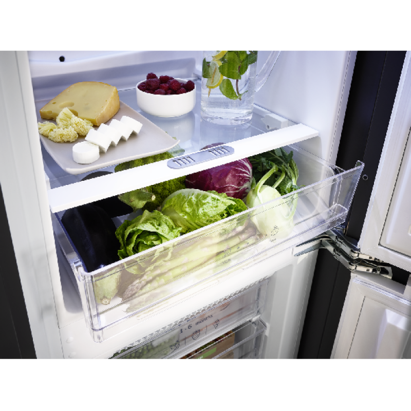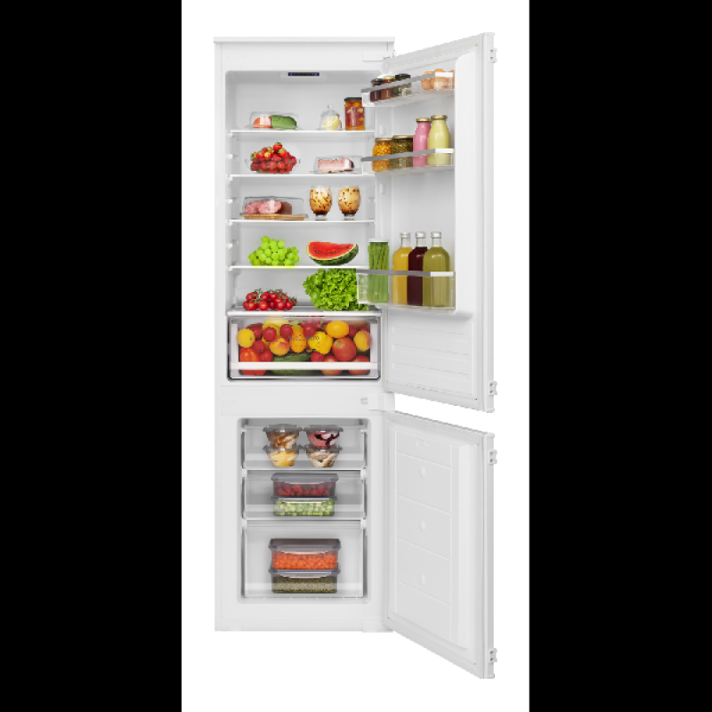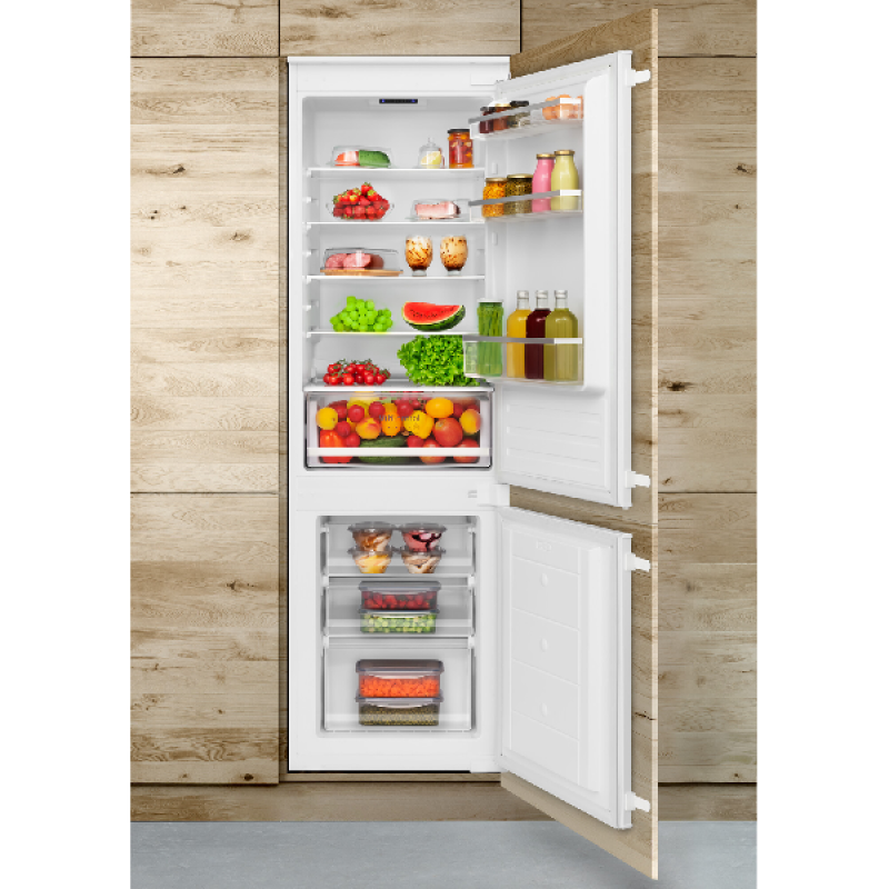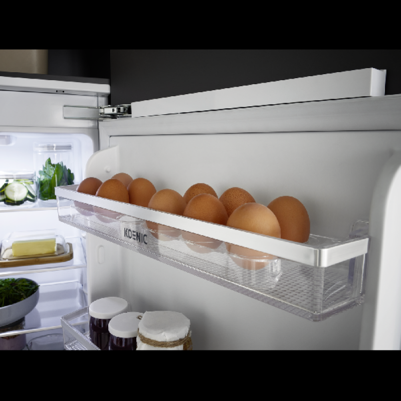 De inbouw koel-vriescombinatie KBK 17711 E van Koenic past discreet in elke inbouwkeuken, netjes weggewerkt achter een kastdeur. Hij biedt ruim voldoende plaats voor al je gekoelde en diepvriesproducten. Met een hoogte van 177,5 cm en een breedte van 55,3 cm heeft hij standaardafmetingen en past hij vlot tussen je andere keukenapparaten. Het koelgedeelte bovenaan heeft een inhoud van 182 liter en is ingedeeld in 5 glazen leggers, waarvan 4 in hoogte verstelbaar, een groente- en fruitlade, en 4 deurvakken voor flessen en potjes. Onderin bevindt zich de diepvriezer met een inhoud van 56 liter, verdeeld over 3 lades van verschillende grootte, om al je diepvriesproducten overzichtelijk op te bergen.